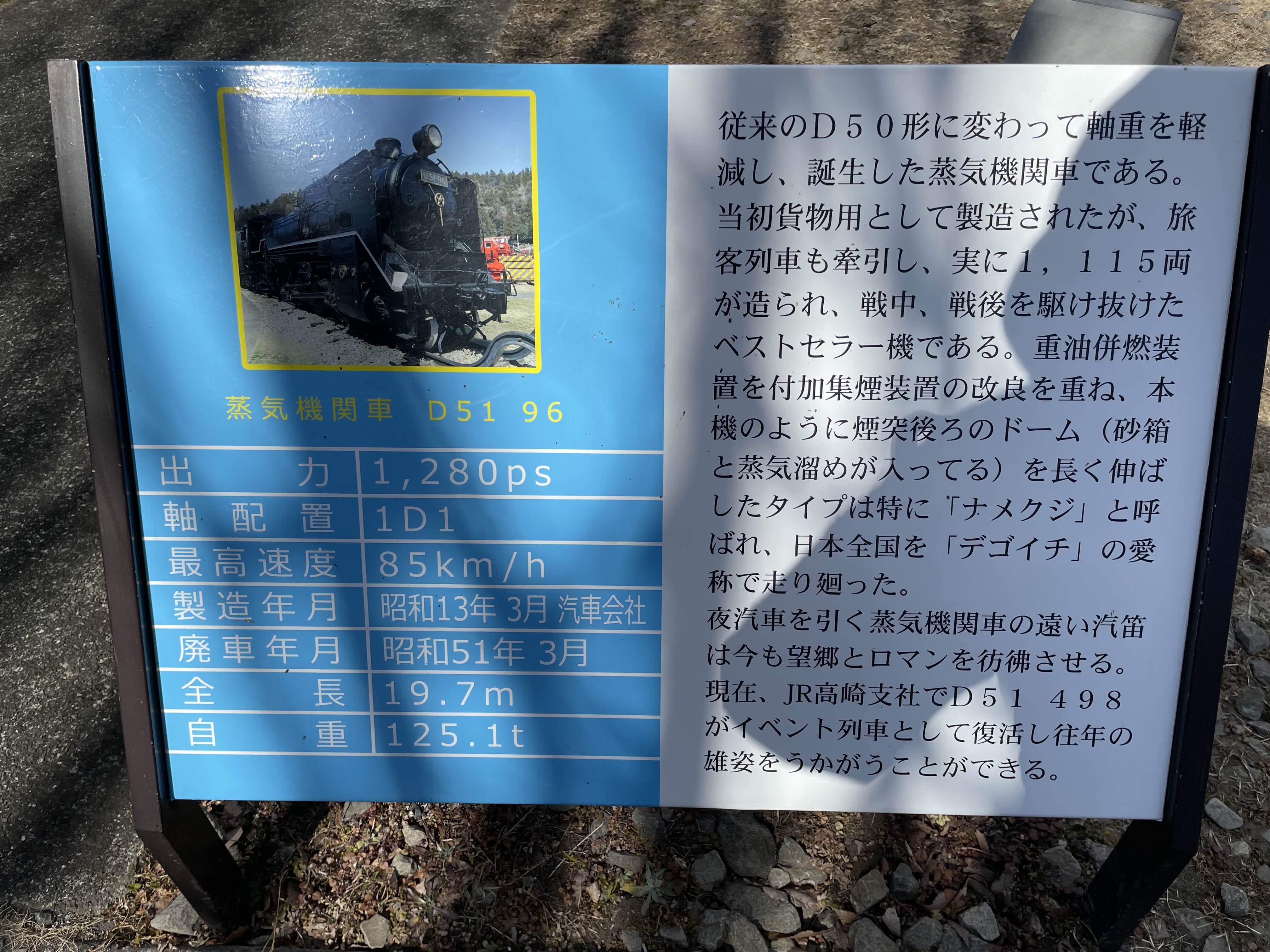 현재 JR 다카사키 지구에서는 D51 498이 이벤트 열차로 복원되어 과거의 영광을 재현하고 있습니다.