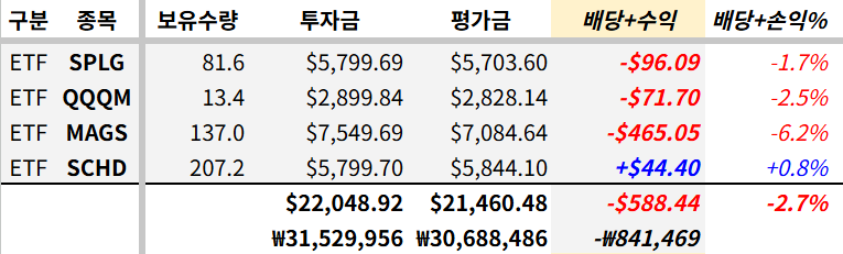 개인적으로 연금투자 쪽에서도 배당소득세 이런걸 떠나서 방어력 확보 차원에서 SCHD를 다시 좀 섞어야겠다