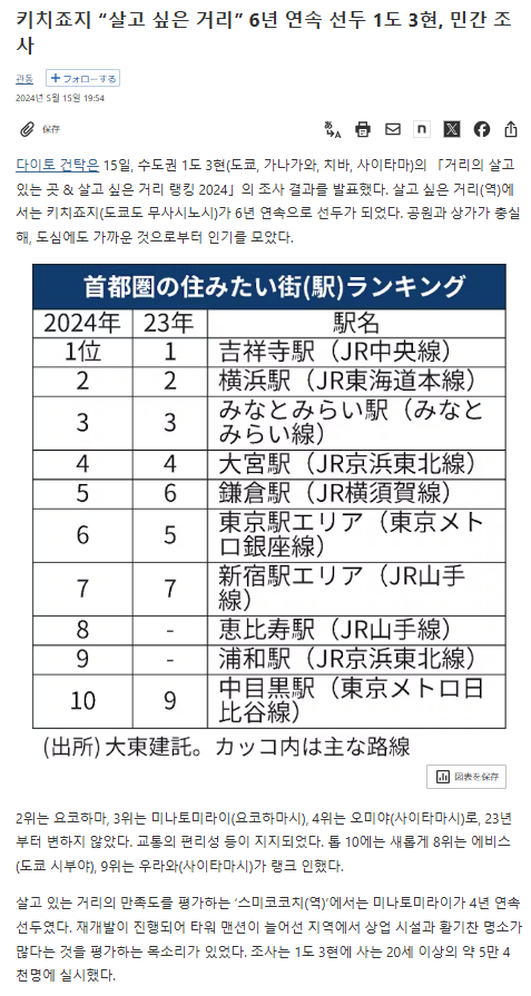 吉祥寺 지역은 일본에서 살기 좋은 도시로 인기가 높습니다. 다음은 그 이유를 요약한 3줄평입니다: