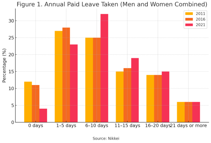 2021년 일본의 연차휴가 사용률은 62.1%로, 1984년 이후 가장 높은 수치를 기록했지만 국제 수준에서는 여전히 낮은 편입니다.