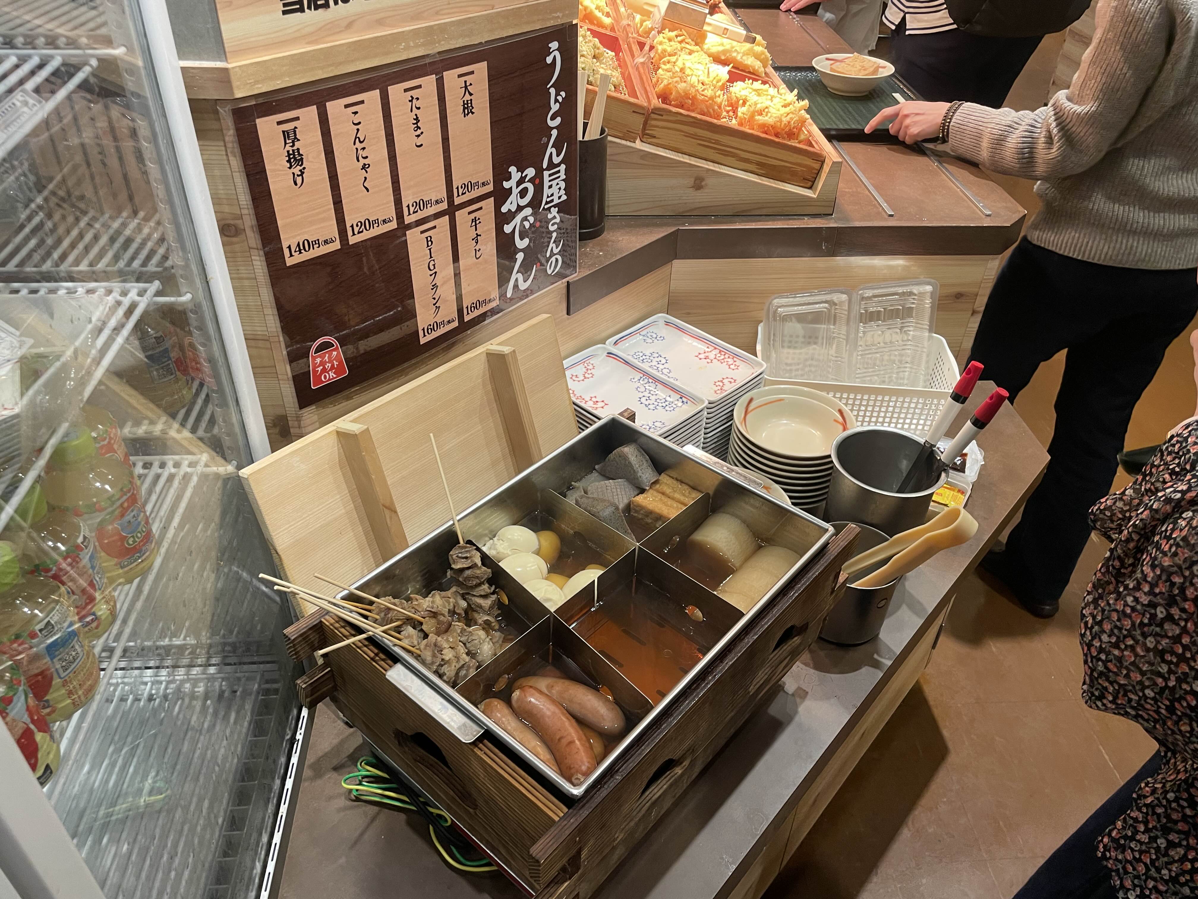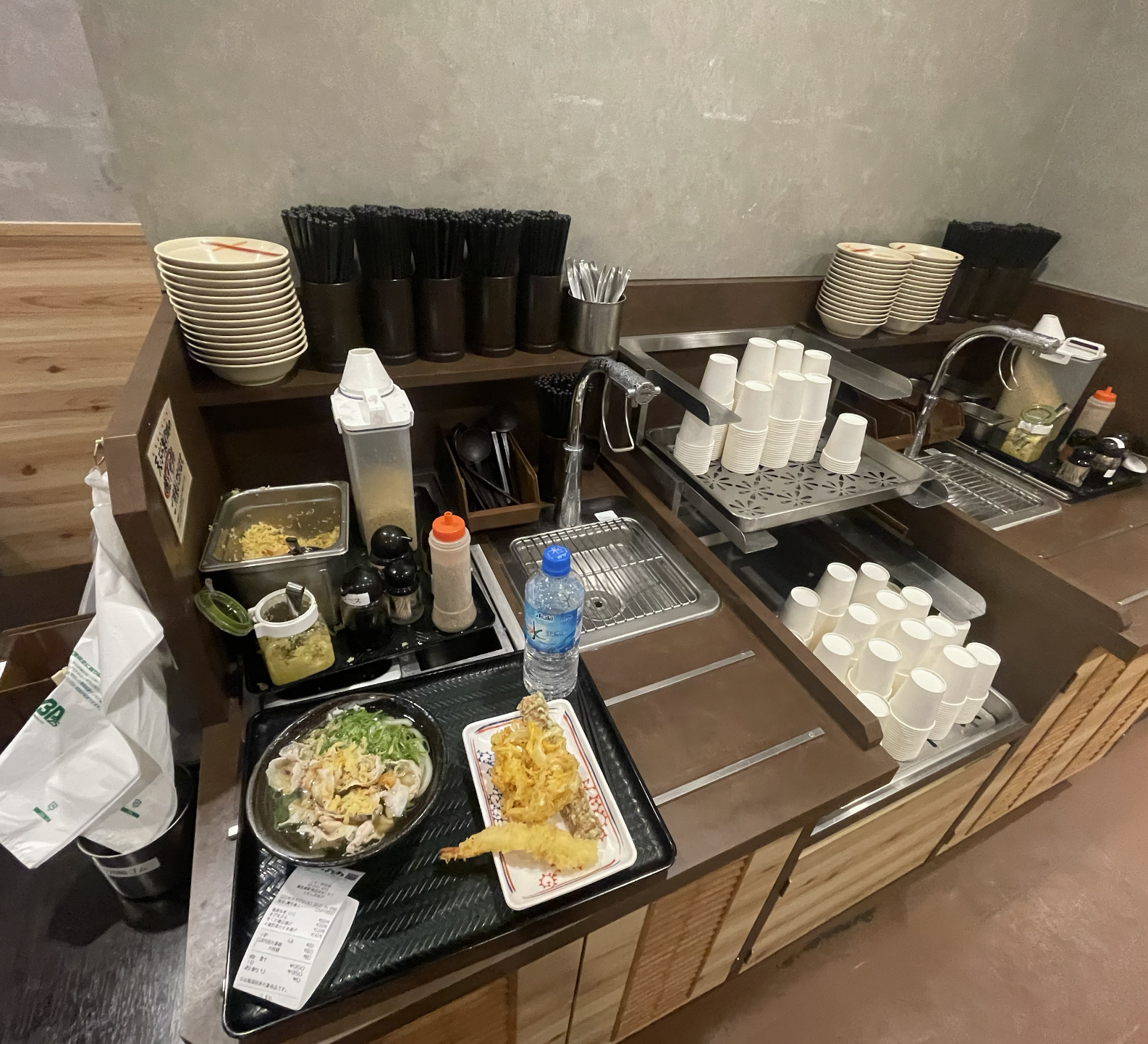 입구에서 튀김을 정하고 가면서 어떤 우동을 먹을지 주문을 하면 그자리에서 우동을 1초만에 만들어서 준다.