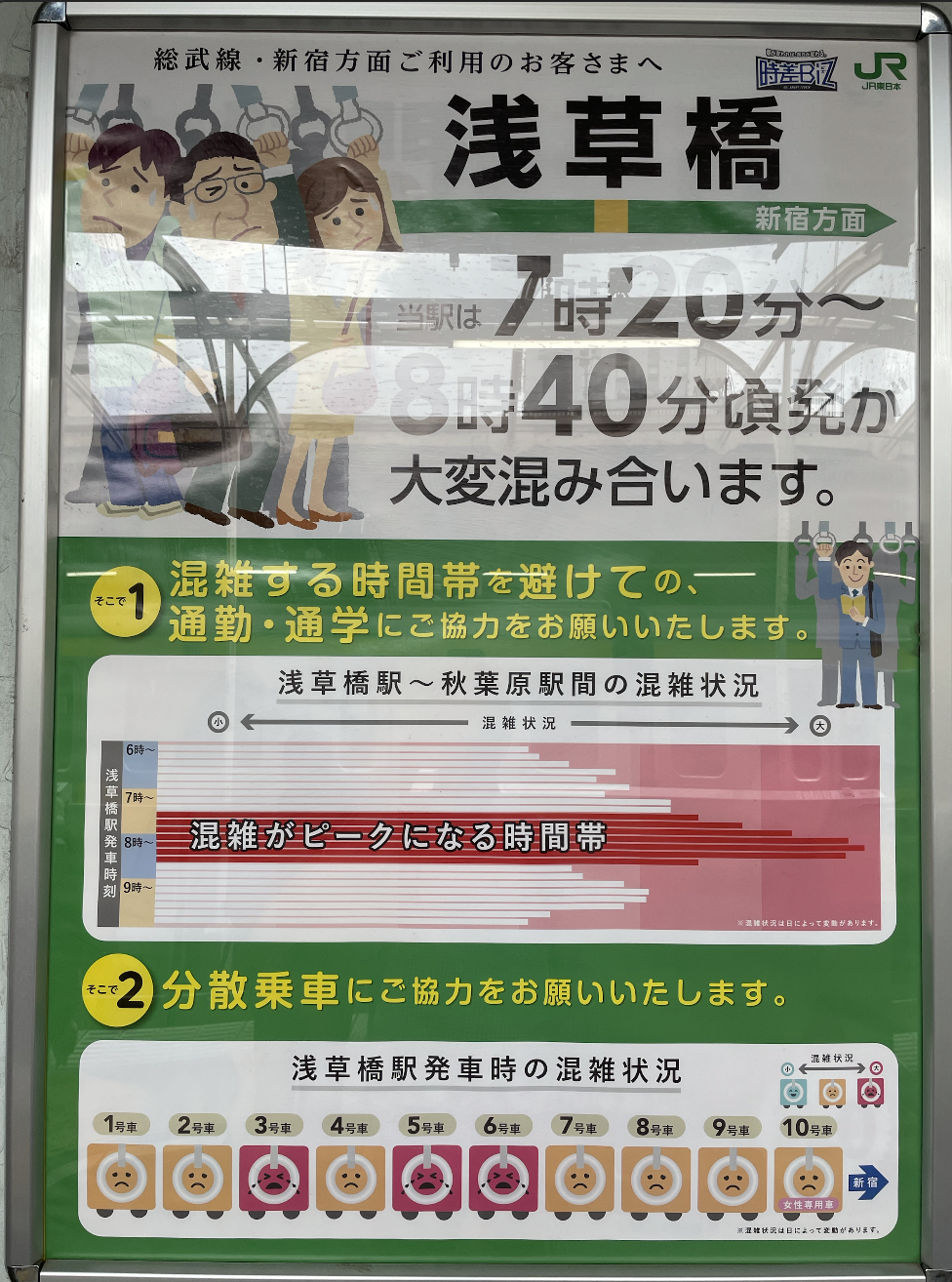 아사쿠사바시에서 출근 지하철을 타는데 신주쿠 방면으로 언제가 가장혼잡하며, 어디가 제일 혼잡한지를 보여준다.