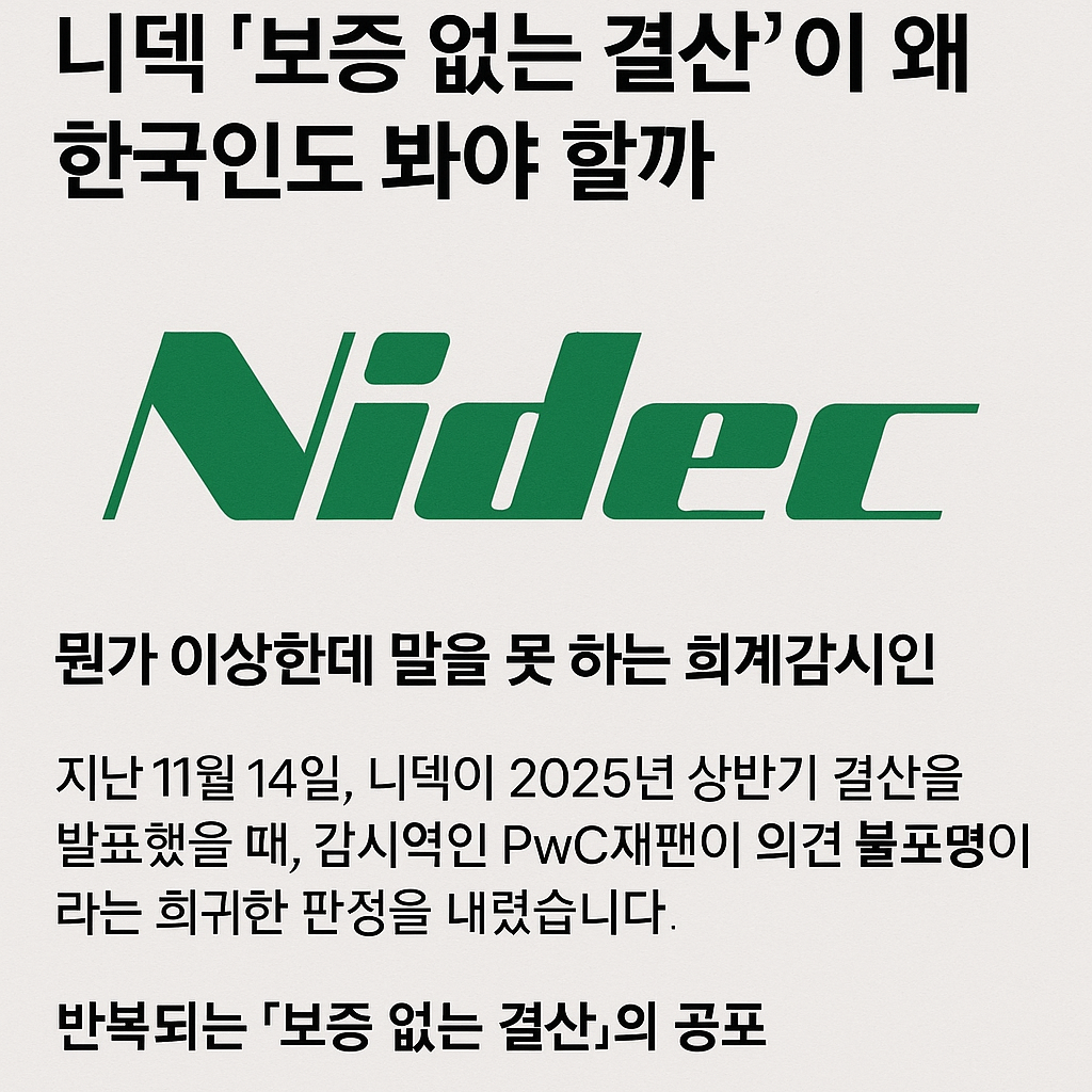 지난 11월 14일, 니덱이 2025년 상반기 결산을 발표했을 때, 감시역인 PwC재팬이 의견 불표명이라는 희귀한 판정을 내렸습니다. 이게 뭘 의미하는가 하면요, 감사인이 "이 재무제표가 맞는지 아닌지 확인할 증거가 없어서 판단을 못 하겠습니다"라고 손을 드는 겁니다.