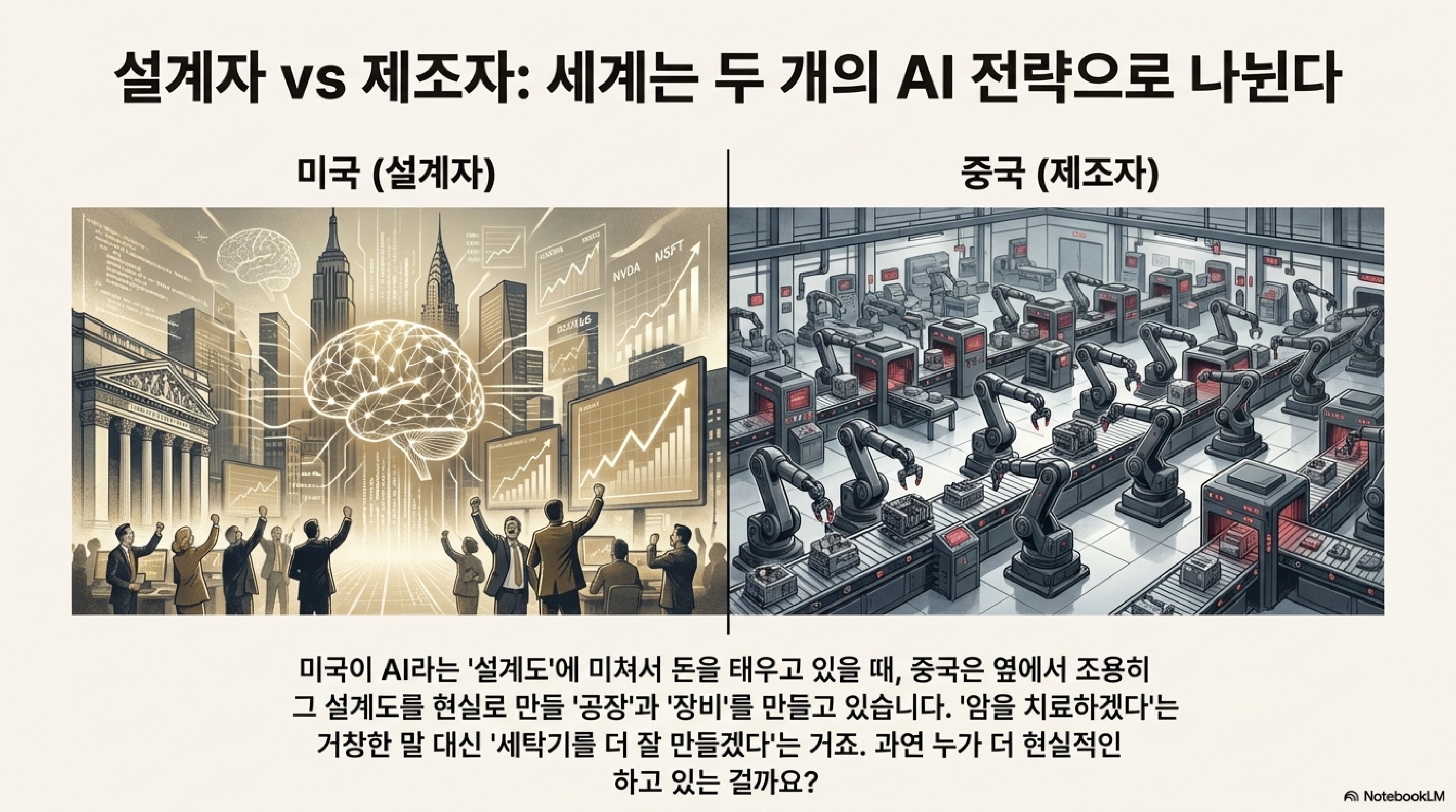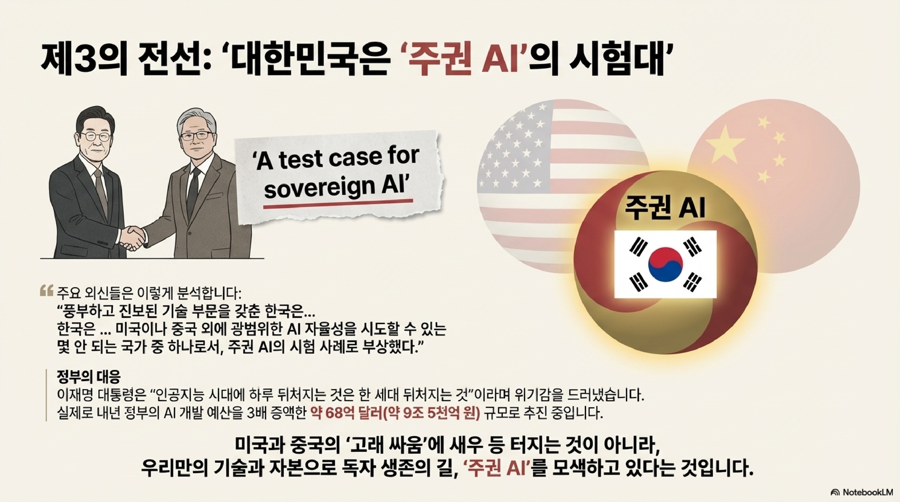 미국이 AI로 월스트리트의 파티를 즐기는 동안, 중국은 AI로 21세기 산업의 만리장성을 쌓고 있는 것입니다. 미국은 금융으로, 중국은 제조업으로 AI 패권 경쟁을 벌이는 와중에, 이 두 거인 사이에서 살아남기 위한 제3의 길이 등장했습니다. 바로 'AI 주권'을 향한 경쟁이며, 그 시험대의 중심에 대한민국이 있습니다.