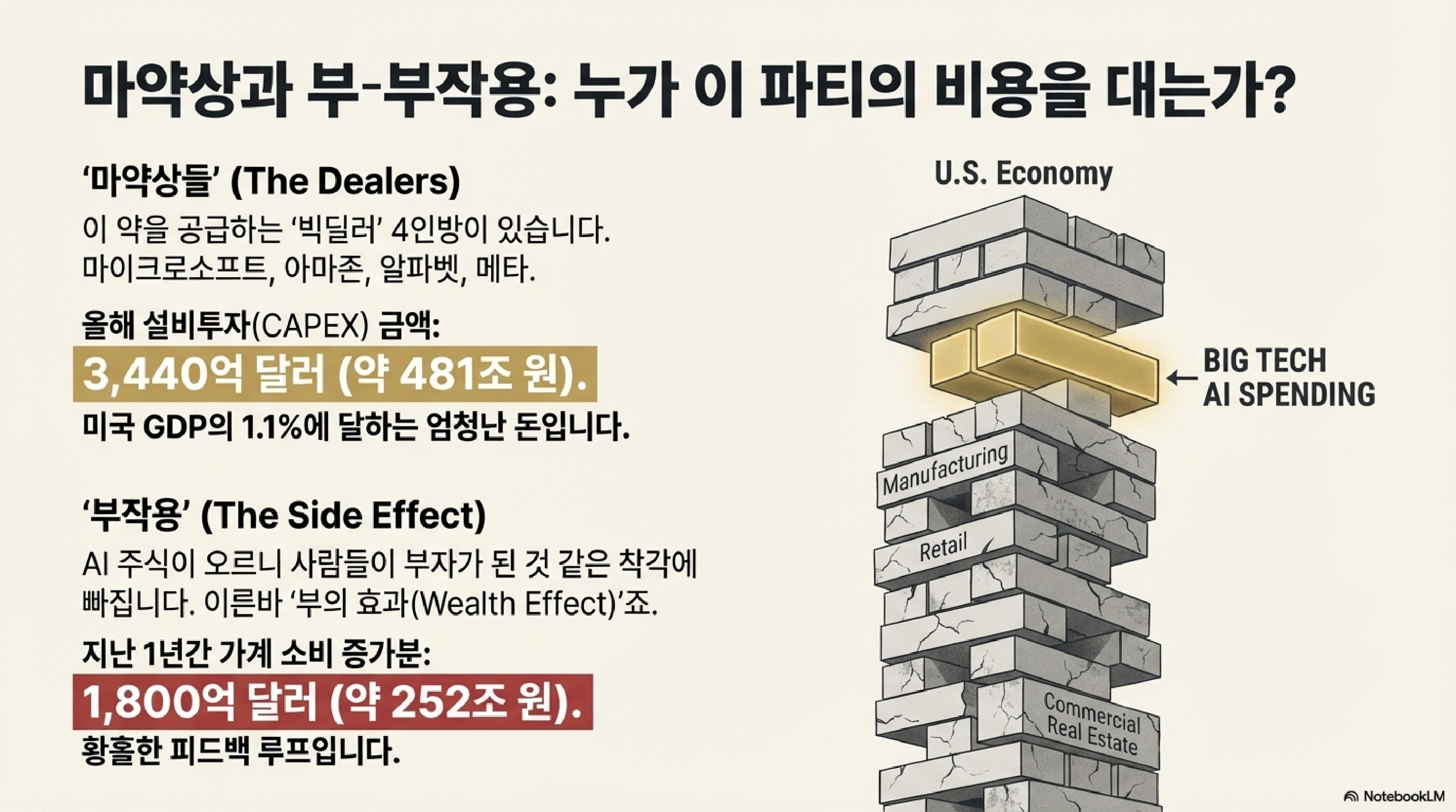 하지만 동전의 양면처럼, 여기에는 '역자산 효과(reverse wealth effect)'라는 무서운 위험이 도사리고 있습니다. 만약 AI 거품이 꺼지면서 주식 시장이 20~30% 폭락하면 어떻게 될까요? Barclays의 조나단 밀러 이코노미스트는 이 경우 GDP 성장이 1%p에서 1.5%p까지 감소할 수 있다고 경고합니다. 스테로이드 약효가 떨어지면 근육이 빠지듯, AI 주가 하락이 소비 절벽으로 이어져 경제 전체를 침체에 빠뜨릴 수 있다는 거죠.