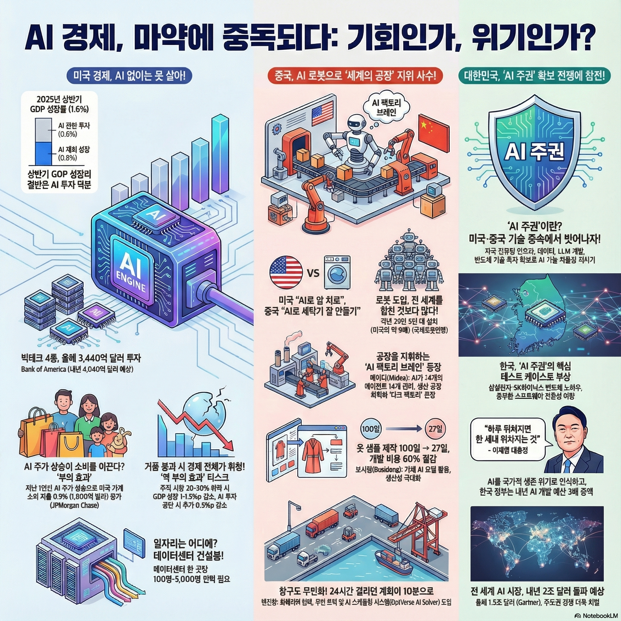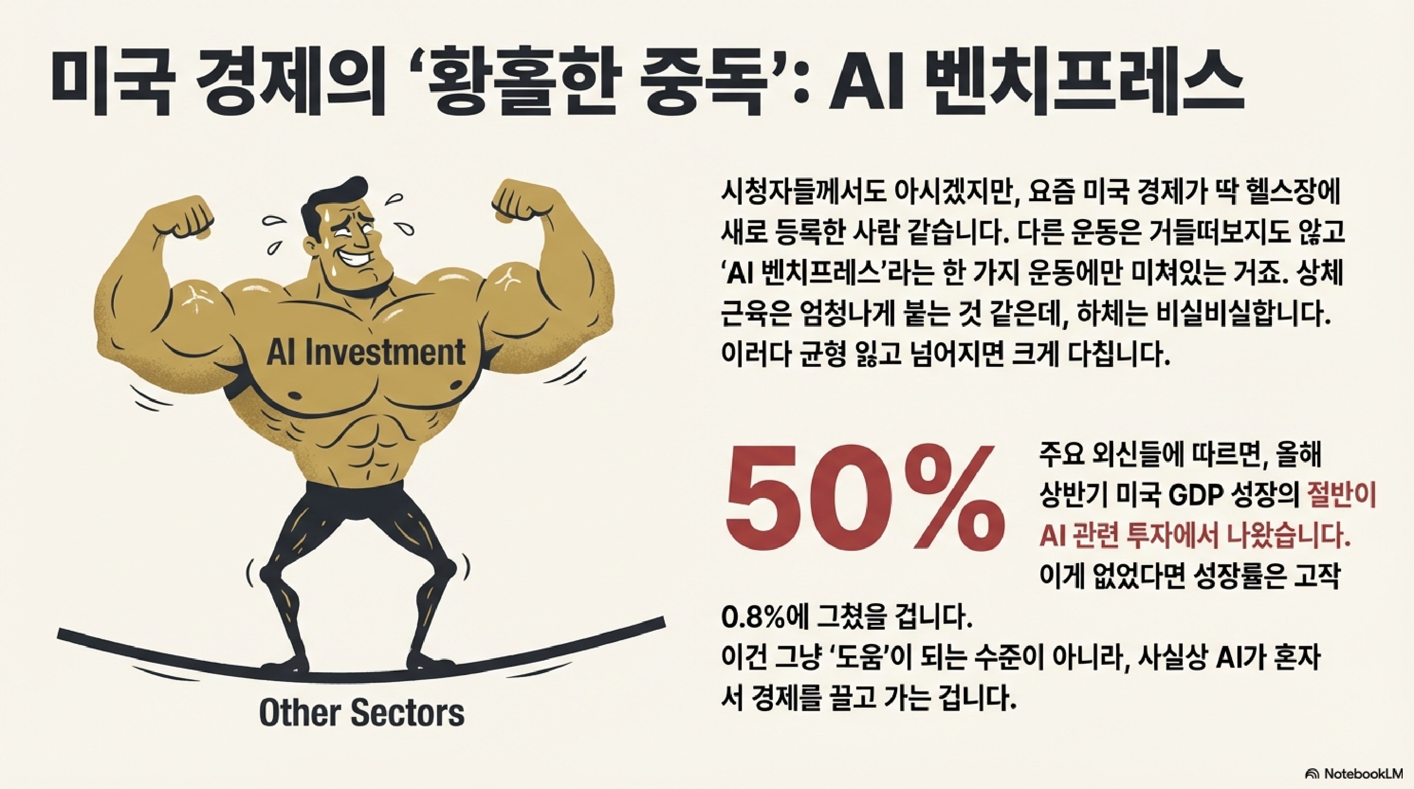 오늘 제가 준비한 세 가지 이야기는요, 겉보기엔 제각각인 것 같지만 사실은 '인공지능(AI)'이라는 하나의 굵은 실로 전부 꿰어지는, 아주 흥미로운 구조를 가지고 있습니다. 첫 번째는 마치 금지 약물처럼 미국 경제를 벌크업시키고 있는 AI 이야기, 두 번째는 세계의 공장 자리를 영원히 지키기 위해 AI 로봇 군단을 양성하는 중국 이야기, 그리고 마지막은 이 두 거인 사이에서 어떻게든 살아남으려는 대한민국의 절박한 AI 생존 전략입니다.