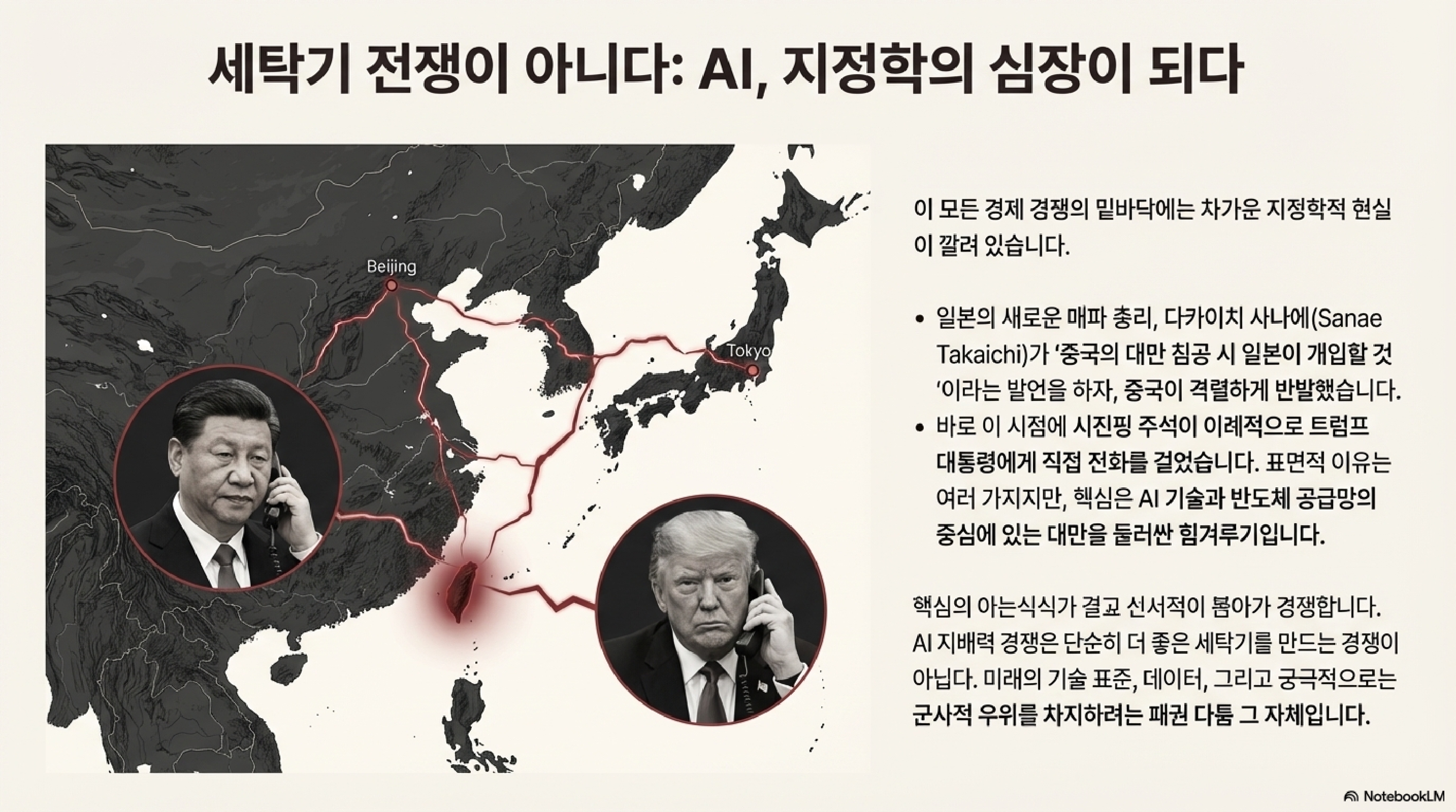 - 미국 모델: AI를 금융과 자산 시장에 직접 연결해 단기적인 경제 성장을 폭발적으로 견인하는 방식입니다. 화끈하지만, 거품 붕괴라는 치명적 리스크를 안고 있죠.