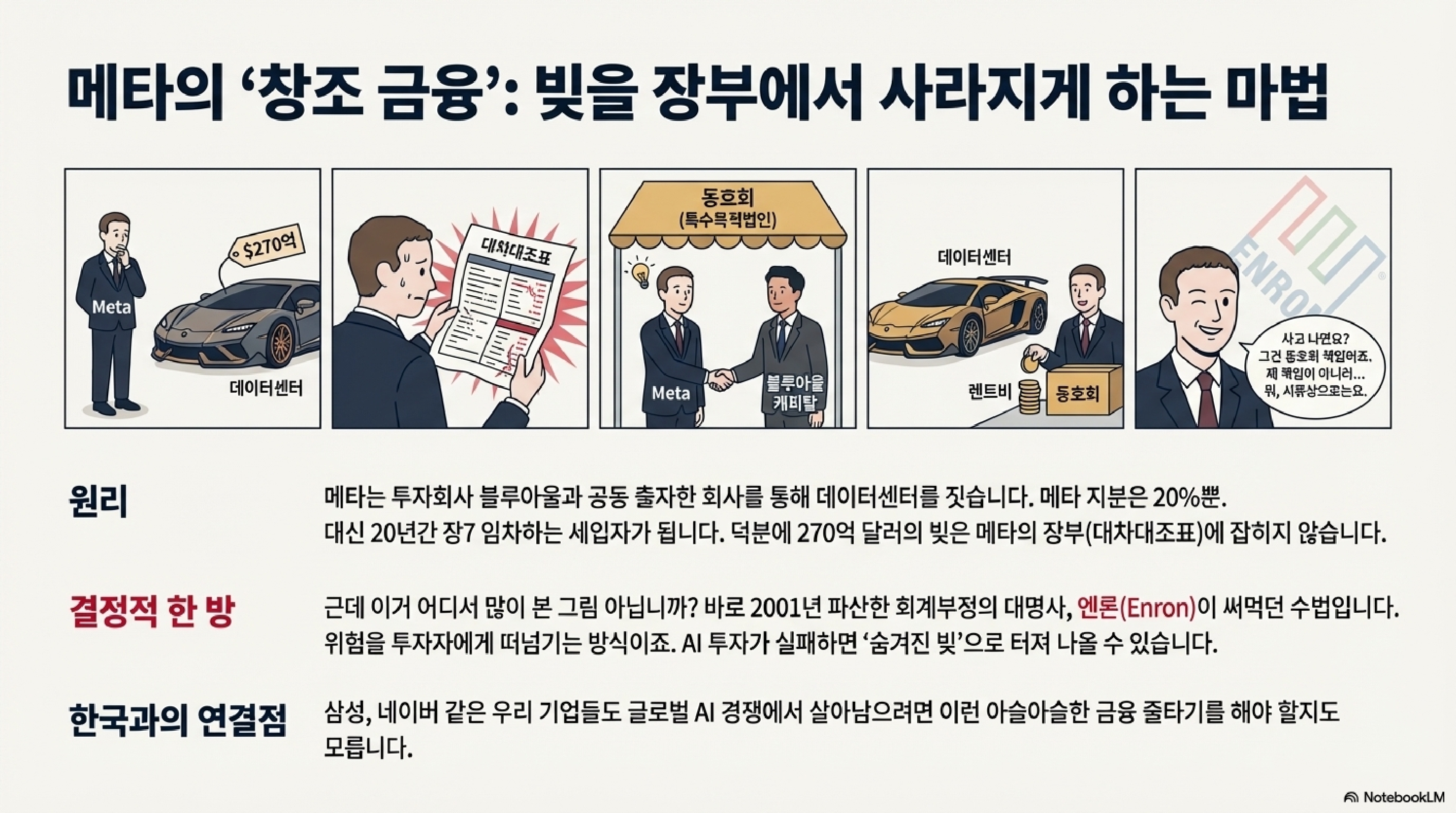 둘째, IT 공룡의 기상천외한 자금 조달법입니다. 페이스북의 모회사 메타(Meta)가 무려 42조 원에 달하는 AI 데이터센터 투자를 하면서도, 자기 회사 장부에는 빚 한 푼 남기지 않는 마법 같은 금융 기법을 쓰고 있습니다. 그 비밀을 파헤쳐 보겠습니다.