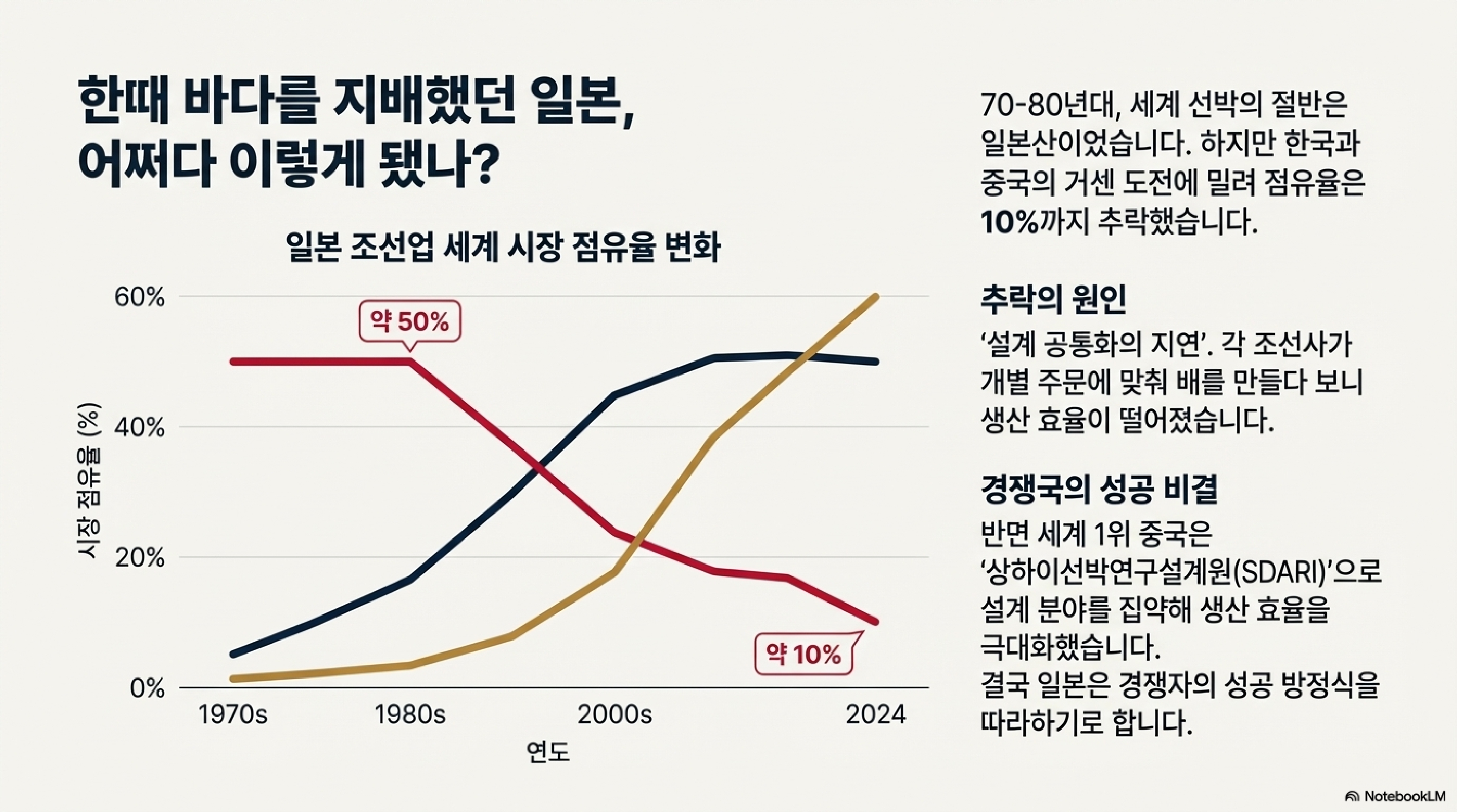 일본 조선업은 1970~80년대 세계 시장 점유율의 절반을 차지할 정도로 막강했습니다. 하지만 2024년에는 10% 수준까지 추락했죠. 가장 큰 패인 중 하나로 지적되는 것이 바로 '설계 공통화의 지연'입니다. 각 해운사의 요구에 맞춰 배를 '맞춤 제작'하다 보니 생산 효율이 떨어졌던 겁니다.