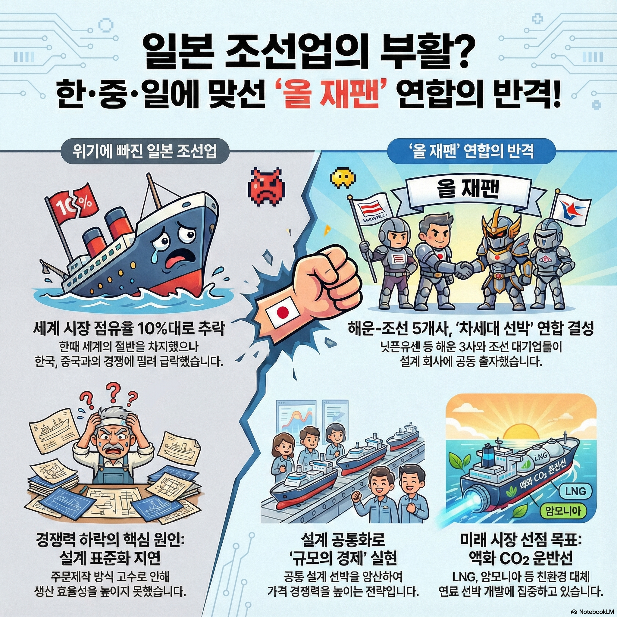 단순한 산업 뉴스가 아닙니다. 이건 국가의 경제 안보와 자존심이 걸린 문제입니다. 한때 세계 바다를 지배했던 일본 조선업. 하지만 한국의 기술력과 중국의 가격 경쟁력에 밀려 그 위상은 옛말이 되었습니다. 그런데 최근, 일본의 해운사와 조선사들이 '올 재팬(All Japan)'이라는 이름 아래 하나로 뭉치기 시작했습니다. 이들의 목표는 단 하나, 바로 '조선 왕국'의 부활입니다.