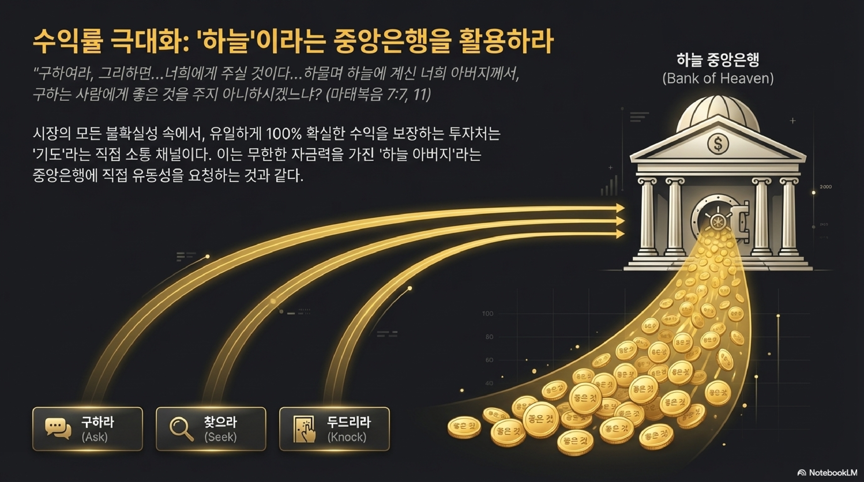 이제 분위기가 반전됩니다. 예수님은 우리에게 어쩌면 세상에서 가장 확실한 투자 원칙, 인생의 ‘치트키’와도 같은 비결을 알려주십니다. ‘구하고, 찾고, 두드리는’ 행위가 단순한 요청을 넘어, 하나님과의 관계를 설정하는 근본적인 태도이며, 이를 통해 우리의 삶이 어떻게 극적으로 변화할 수 있는지를 보여줍니다.