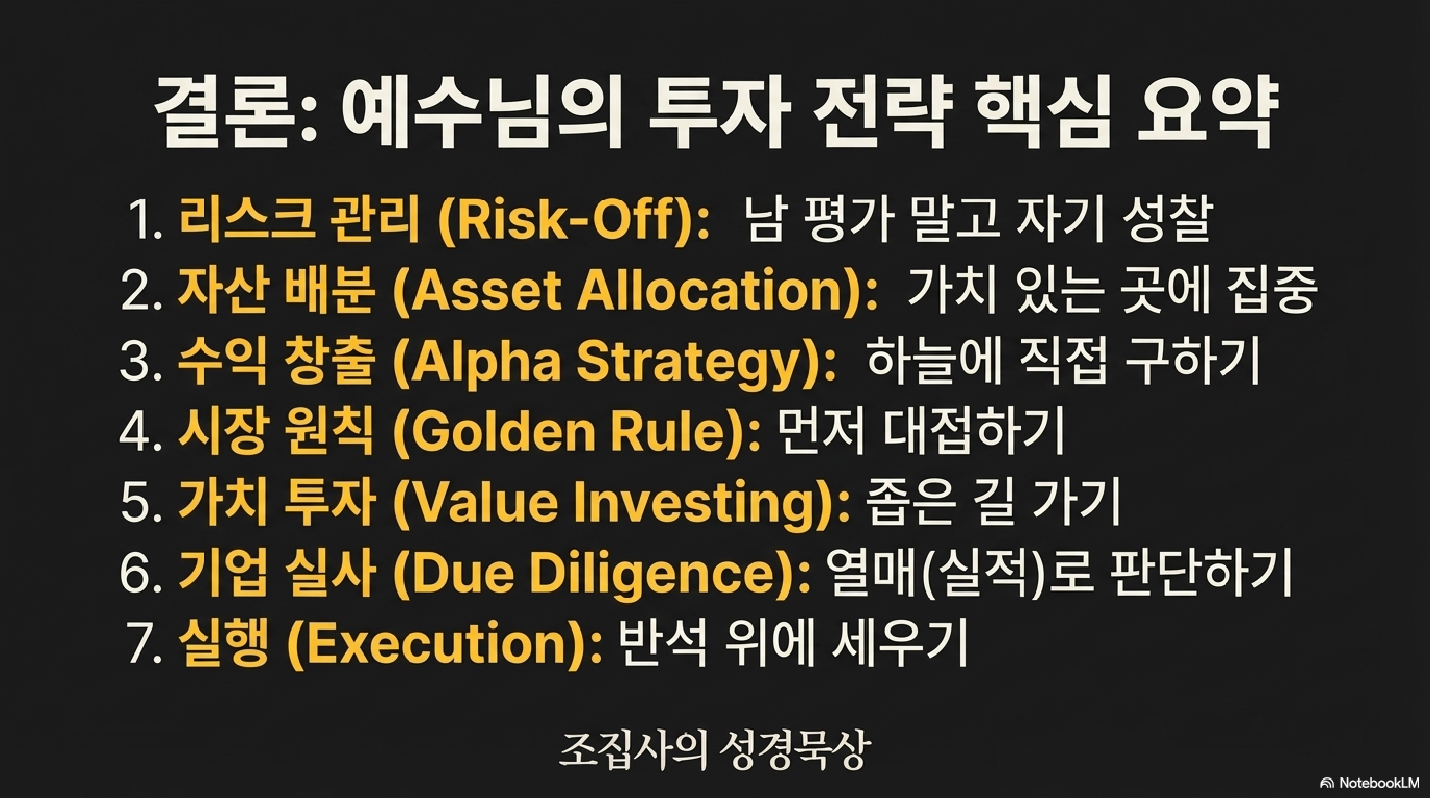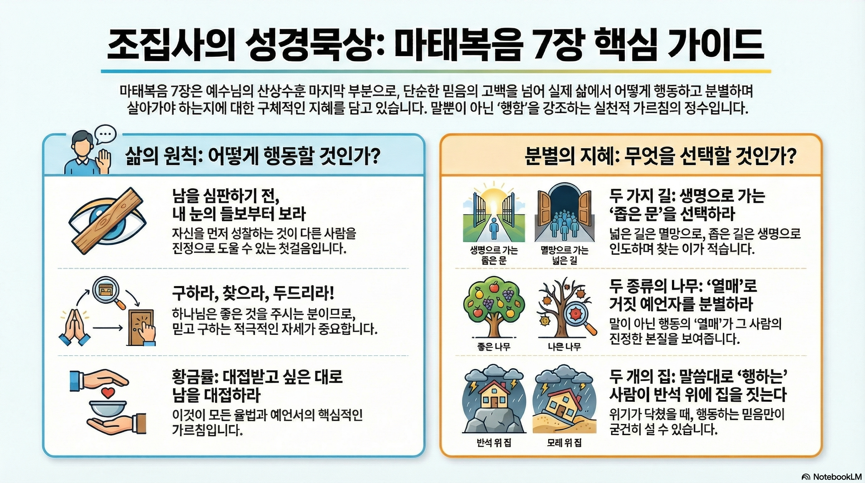 마지막 비유는 마태복음 5장부터 길게 이어진 산상수훈 전체의 장엄한 결론입니다. 이 비유는 ‘듣기만 하는 지식’과 ‘행함으로 이어지는 지혜’의 결정적인 차이를 보여주며, 이것이 인생의 성패를 가르는 궁극적인 기준이 됨을 선포합니다.