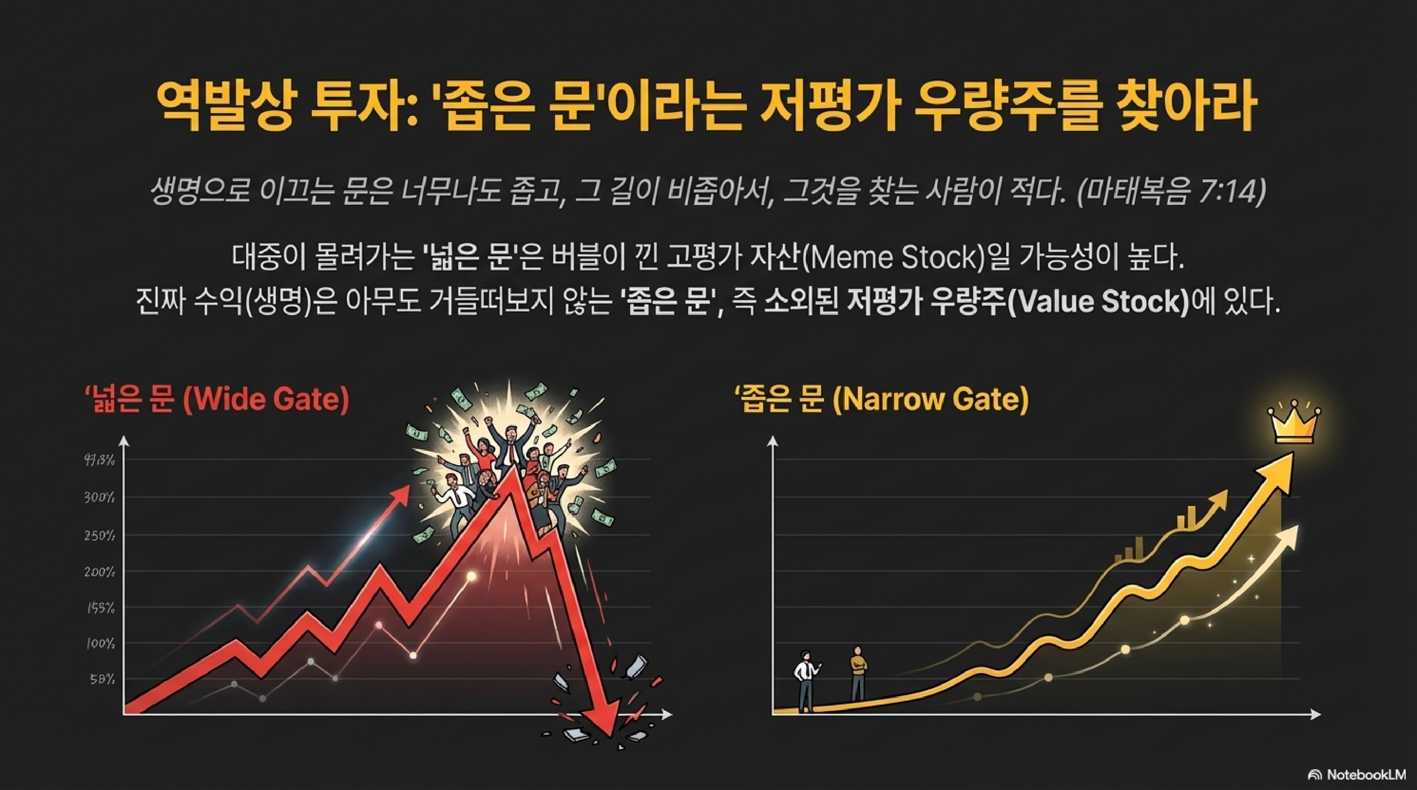 멸망으로 이끄는 문은 넓고 그 길은 널찍합니다(13절). 왜 다들 넓은 길로 갈까요? 간단합니다. 그 길이 편하고, 인스타그램에 자랑하기 좋고, 무엇보다 '나만 뒤처지는 것 같다'는 공포를 잠재워주기 때문입니다. 생각하기를 멈추고 그저 군중 속에 묻어가는 것만큼 안락한 마약은 없죠.