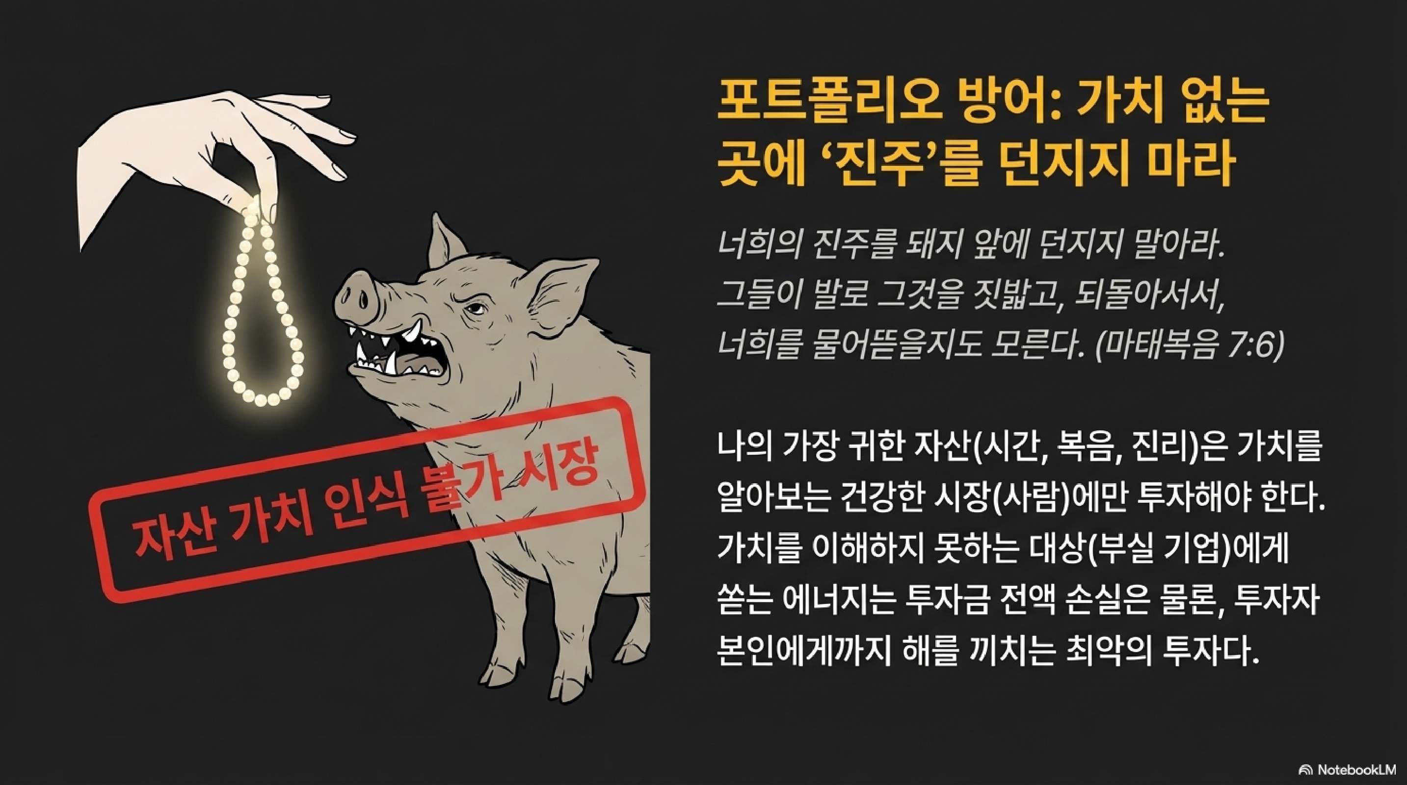 그런데 바로 여기서 예수님의 가르침은 더 깊어집니다. 6절에서 갑자기 이런 말씀을 하시죠. "거룩한 것을 개에게 주지 말고, 너희의 진주를 돼지 앞에 던지지 말아라." 예수님은 방금 남을 심판하지 말라고 하셨는데, 곧바로 누구를 '개'나 '돼지'로 비유하며 분별하라고 하십니다. 이것은 모순처럼 들릴 수 있습니다. 하지만 핵심은 심판의 '동기'와 '목적'에 있습니다. 앞선 심판은 자신의 들보를 가리기 위한 정죄(condemnation)이지만, 뒤의 분별(discernment)은 진리의 가치를 지키기 위한 지혜입니다. 악성 댓글러와 밤새도록 키보드 배틀을 벌이는 것처럼, 가치 있는 진주를 받아들일 준비가 안 된 이들에게 에너지를 쏟는 것은 무의미합니다. 그들은 당신의 진심을 물어뜯고 상처만 남길 뿐입니다.