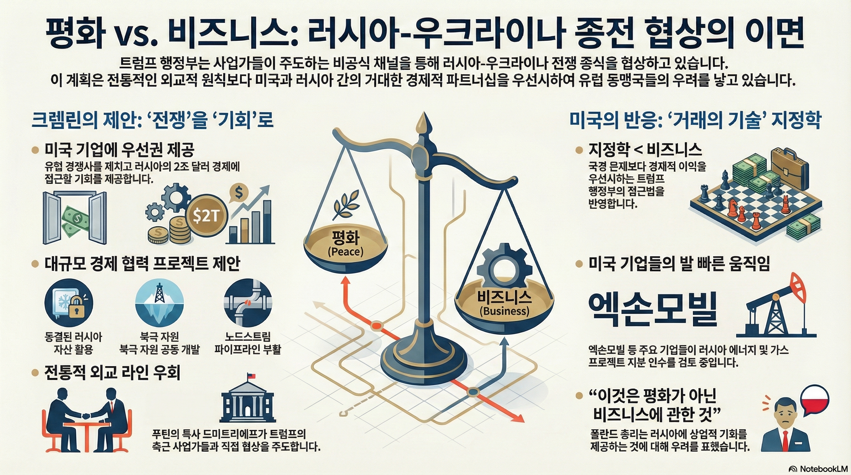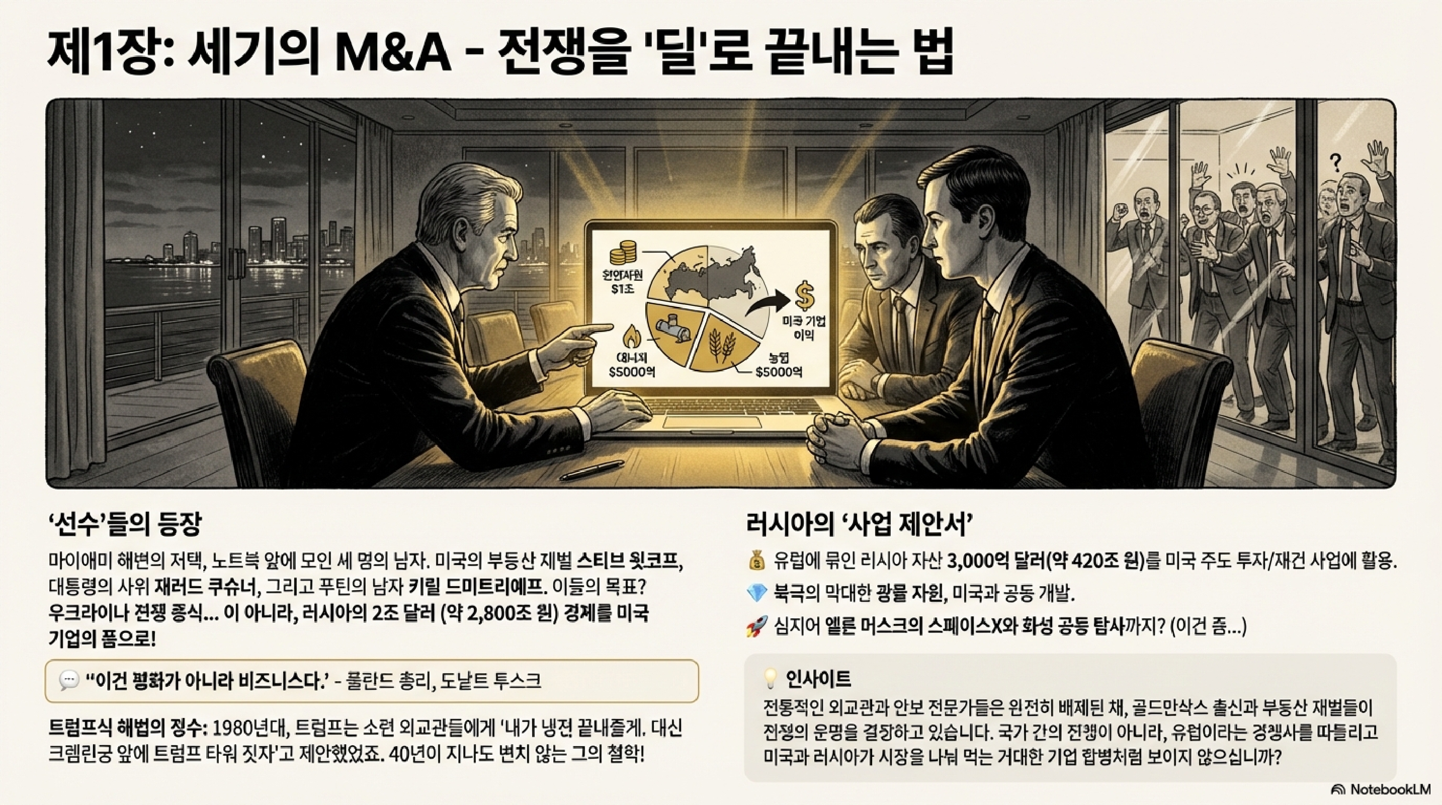 자, 첫 번째 이야기입니다. 지금 미국과 러시아가 우크라이나 전쟁을 끝내기 위해 비밀리에 만나고 있다는 소식, 주요 외신들을 통해 다들 접하셨을 겁니다. 그런데 말입니다, 이 협상, 우리가 아는 그런 점잖은 외교 협상이 아닙니다. 이건 거대한 비즈니스 거래, 일종의 ‘빅딜’에 가깝습니다.