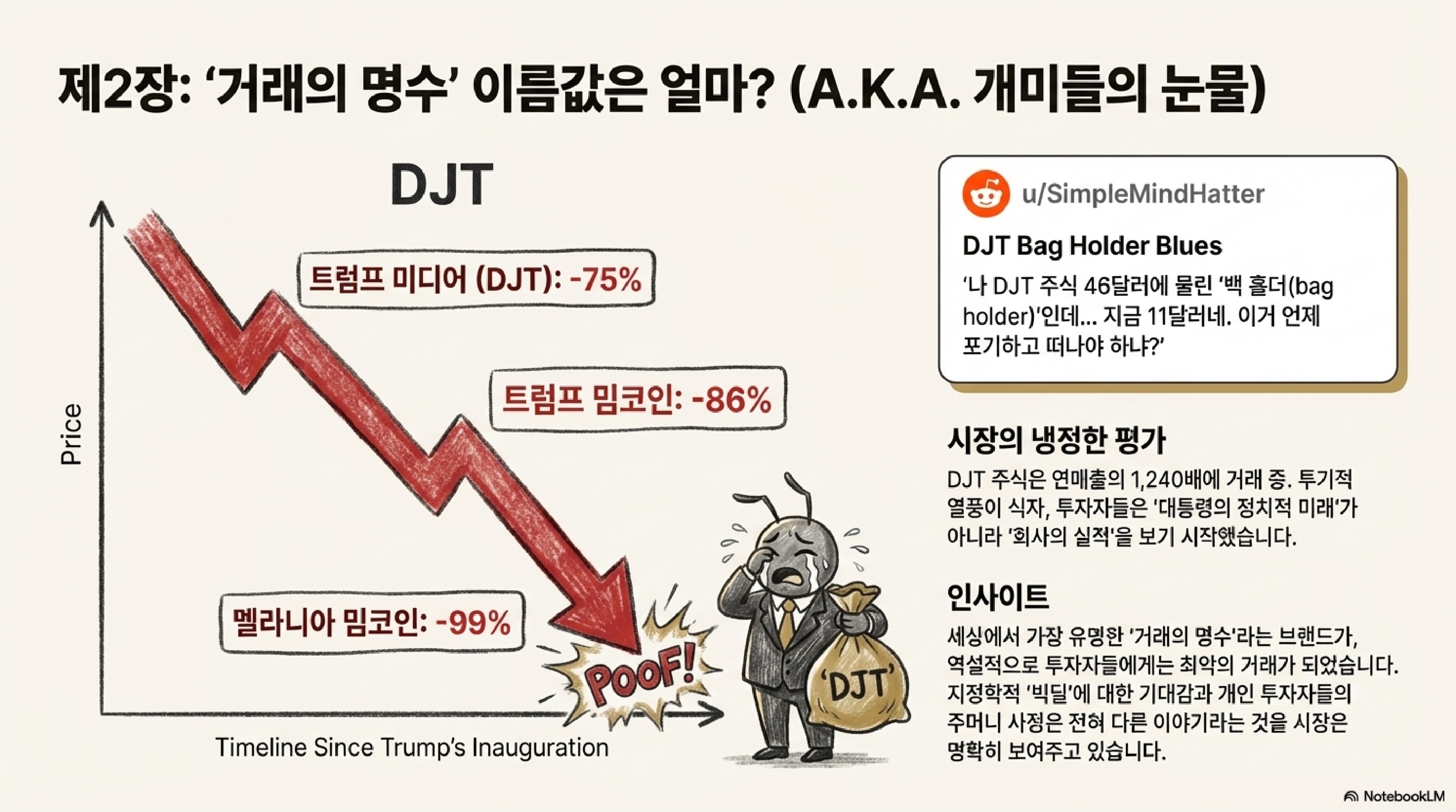 다음 이야기로 넘어가 보겠습니다. 참 아이러니한 상황입니다. 트럼프 대통령의 정치적 브랜드 가치는 하늘을 찌르는데, 정작 금융 시장에서 ‘트럼프 브랜드’가 붙은 상품들의 가치는 바닥을 모르고 추락하고 있습니다. 이건 현재 시장이 얼마나 투기적이고, 또 투자자들이 얼마나 극심한 불안감에 시달리고 있는지를 보여주는 중요한 지표입니다.