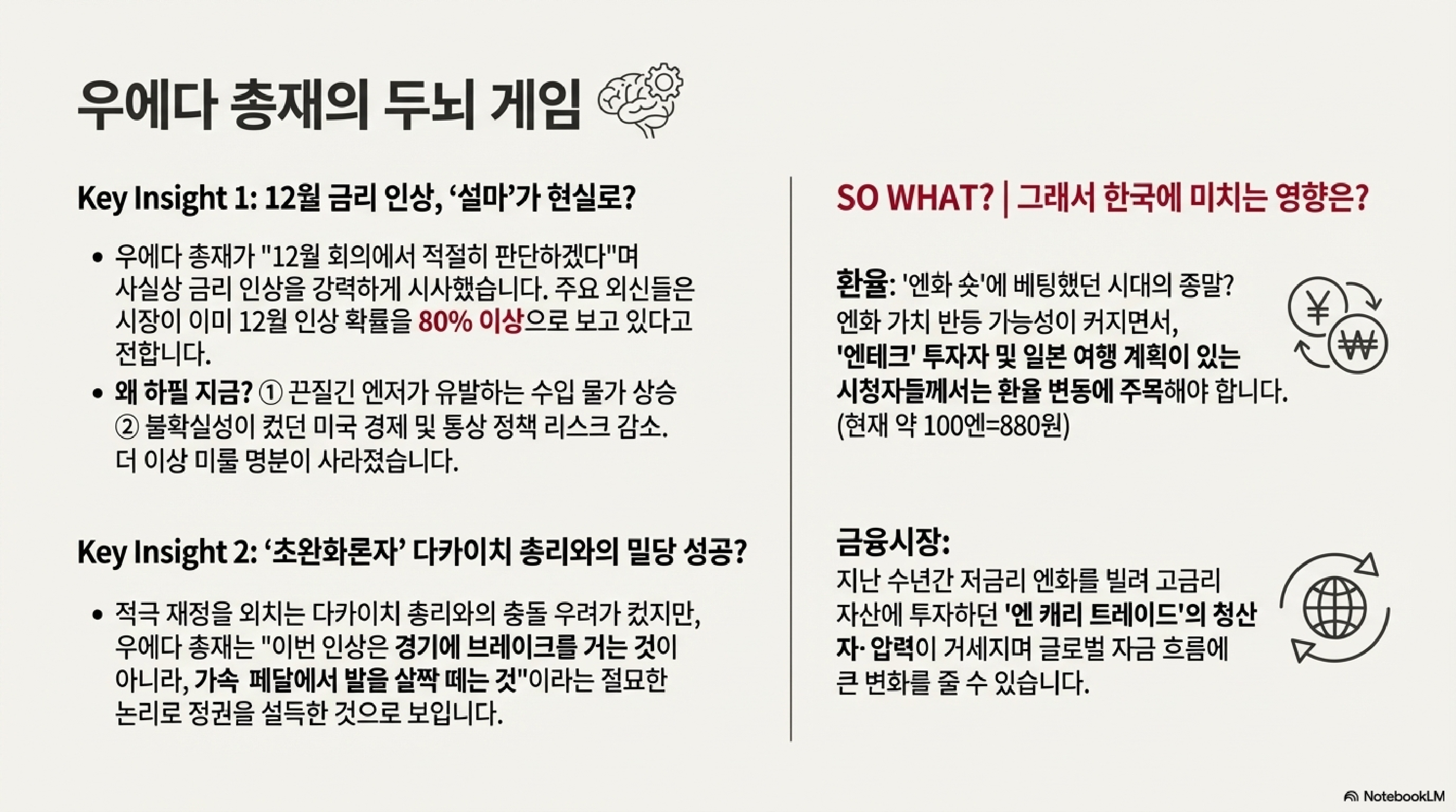 사건의 발단은 우에다 가즈오 일본은행 총재의 입에서 나왔습니다. 그는 최근 기자회견에서 시장의 예상을 뛰어넘는 발언을 쏟아냈습니다. 만약 금리를 올리더라도 "여전히 완화적인 상황일 것(まだ緩和的な状況だ)"이라고 말하며 금리 인상의 충격이 크지 않을 것이라는 밑밥을 깔았습니다. 결정적으로, 오는 12월 금융정책결정회의에서 "금리 인상의 장단점을 적절히 판단하겠다"고 못을 박았습니다. 이는 수십 년간 약한 불로만 뭉근하게 끓이던 셰프가 "이제 슬슬 불을 좀 올려볼까 합니다"라고 공식 선언한 것이나 다름없습니다. 시장이 발칵 뒤집힌 것은 당연한 수순이었습니다.
