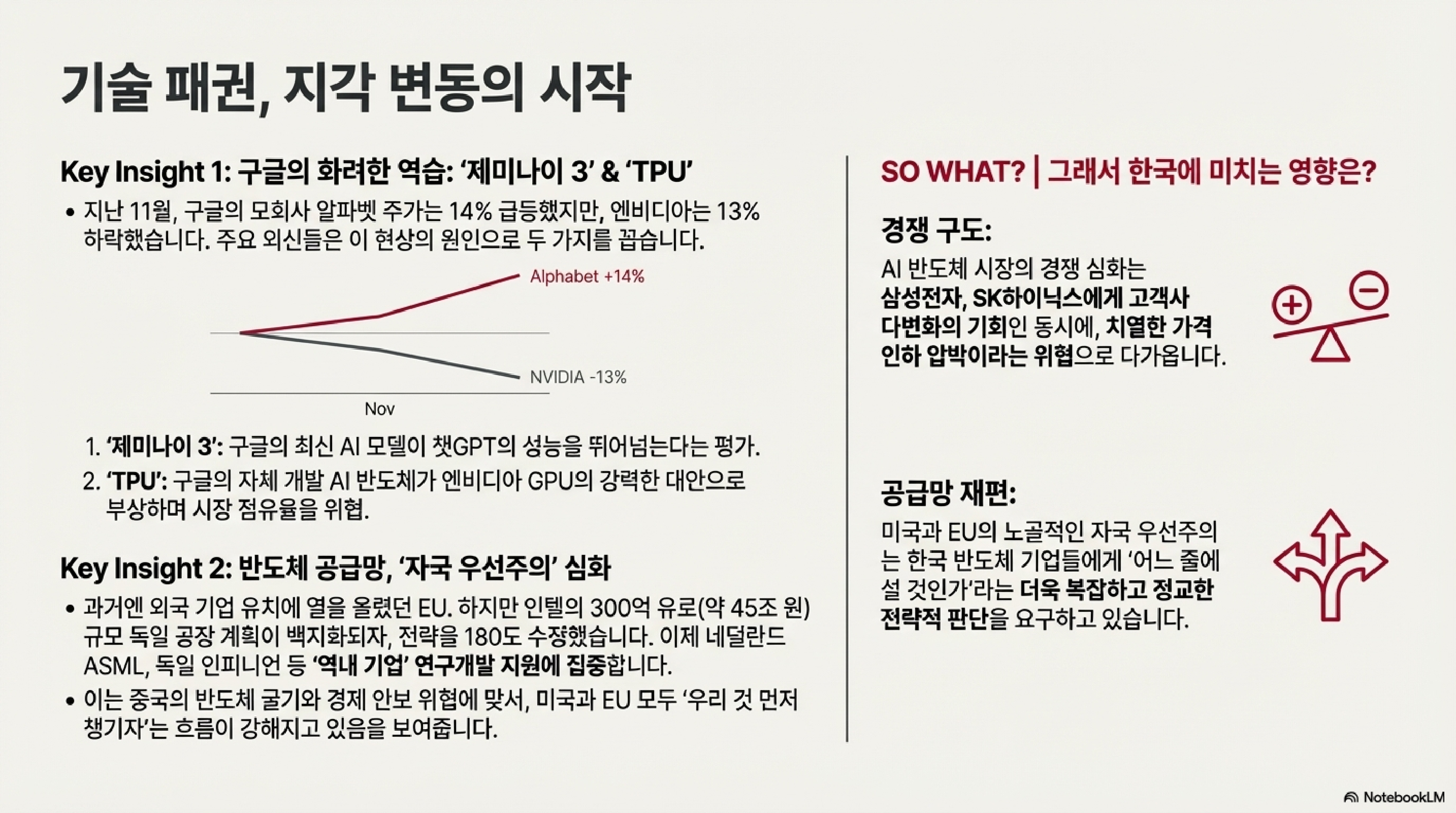 - 독자 개발 칩 'TPU'의 확산: 구글이 자체 설계한 AI 반도체 TPU가 엔비디아 GPU의 강력한 대안으로 떠오르고 있습니다. 특히 앤스로픽과 같은 유력 AI 기업에 공급되고, 메타까지 채용을 검토한다는 소식이 전해지면서 엔비디아의 독점 체제를 깰 수 있다는 기대감이 폭발했습니다.