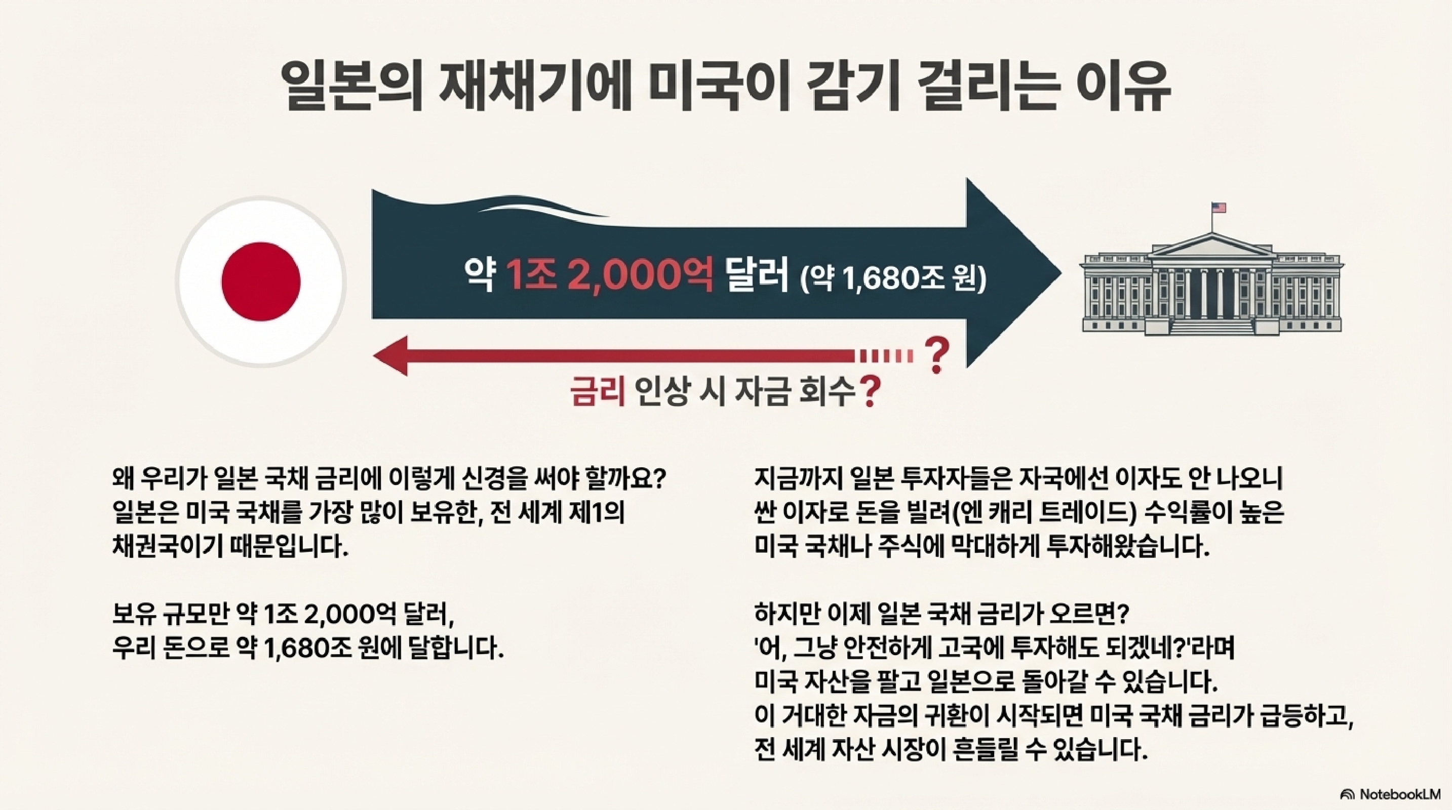 특히 문제가 되는 것은 미국 국채 시장입니다. 일본은 미국 국채를 약 1,680조 원(1.2조 달러)이나 보유한 최대 해외 채권국입니다. 만약 일본 투자자들이 미국 국채를 대거 팔고 엔화로 환전해 돌아간다면, 미국 국채 가격은 폭락하고 금리는 치솟을 수 있습니다. 이는 곧 미국의 대출 금리, 나아가 전 세계의 대출 금리를 끌어올리는 연쇄 효과를 낳게 됩니다.
