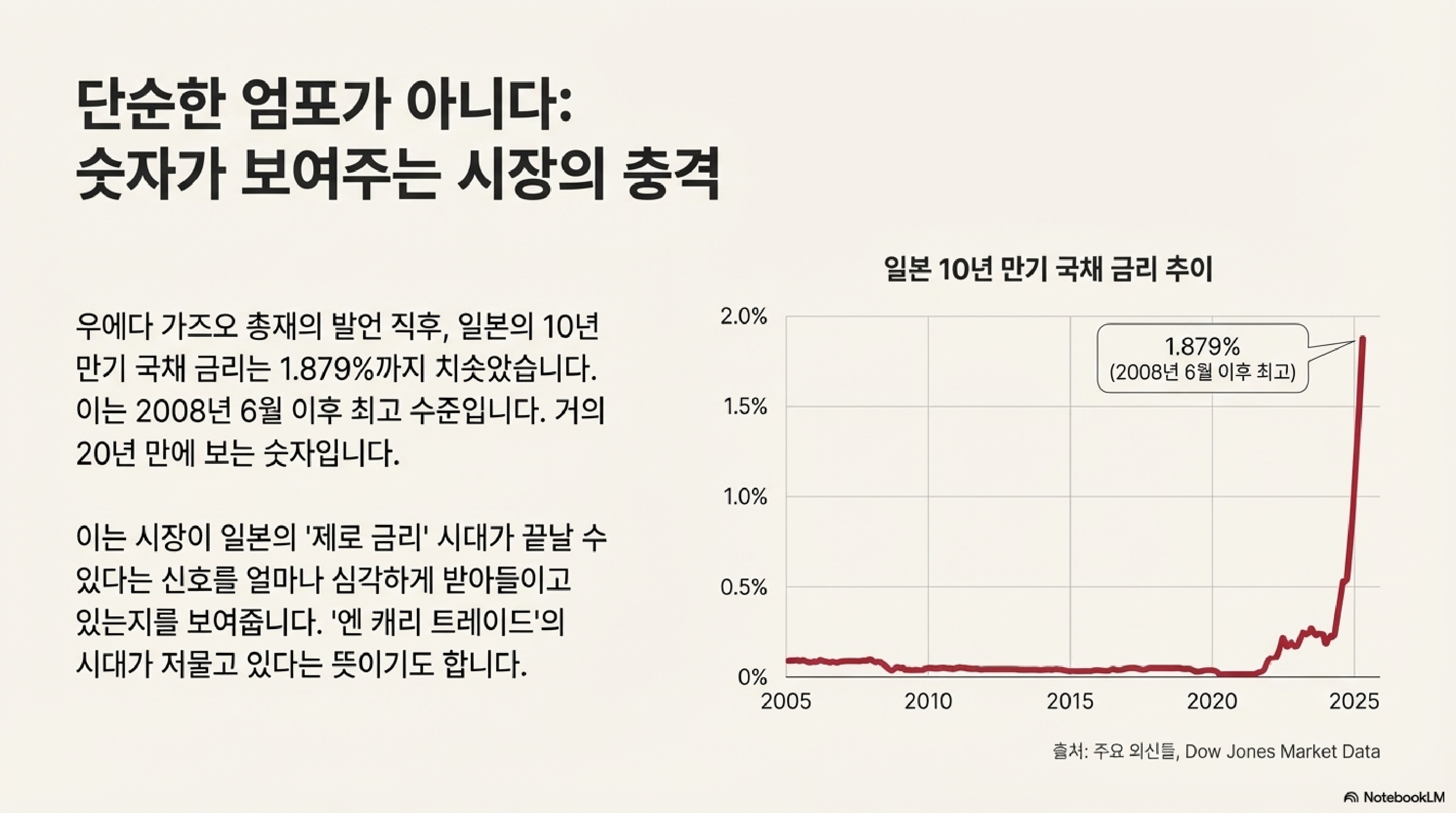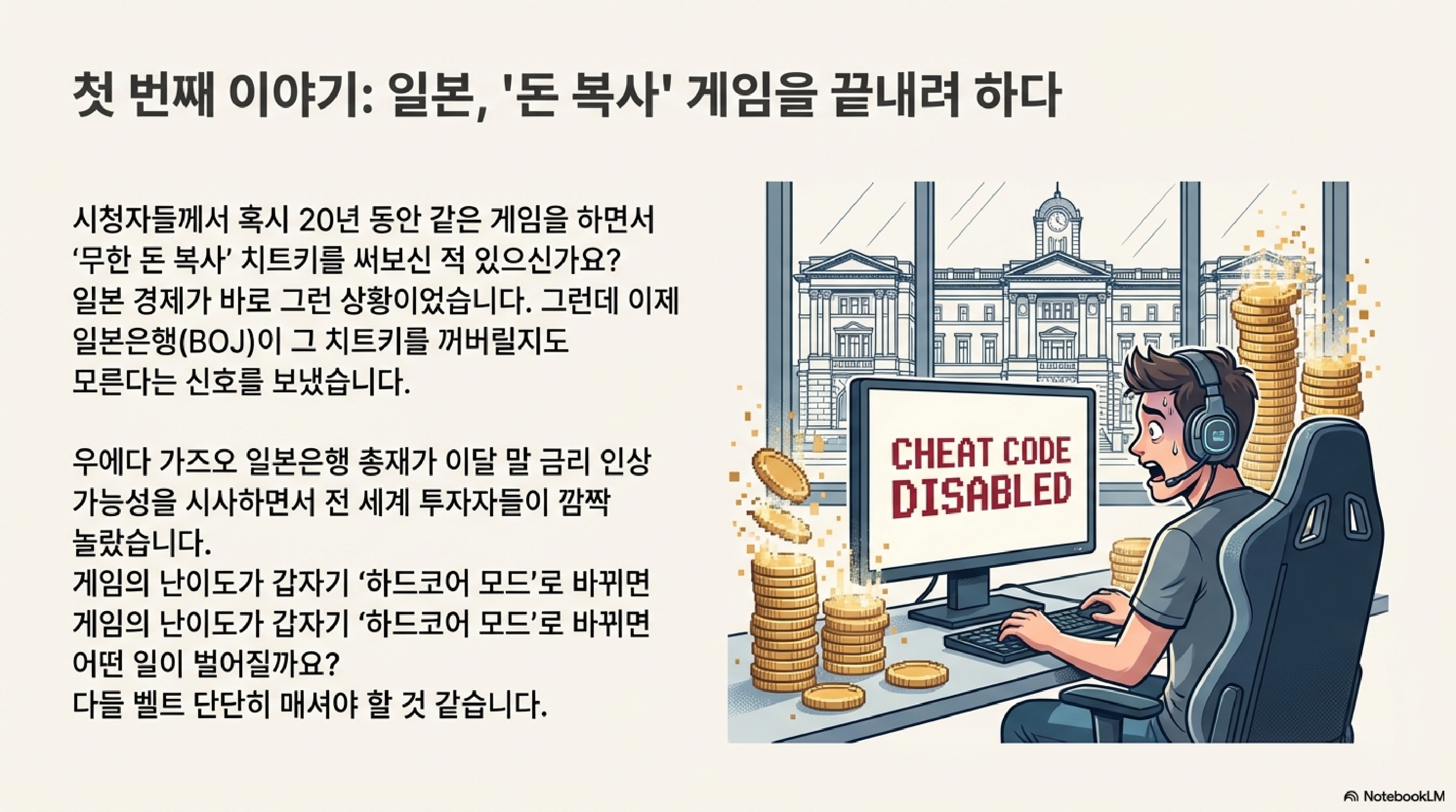 마지막 이야기는 수십 년간 '제로 금리'라는 동굴 속에서 잠자던 사자, 일본이 드디어 깨어날지도 모른다는 소식입니다. 일본은행(BOJ)의 잠재적인 금리 인상 가능성이 제기되면서 전 세계 금융시장이 긴장하고 있습니다.