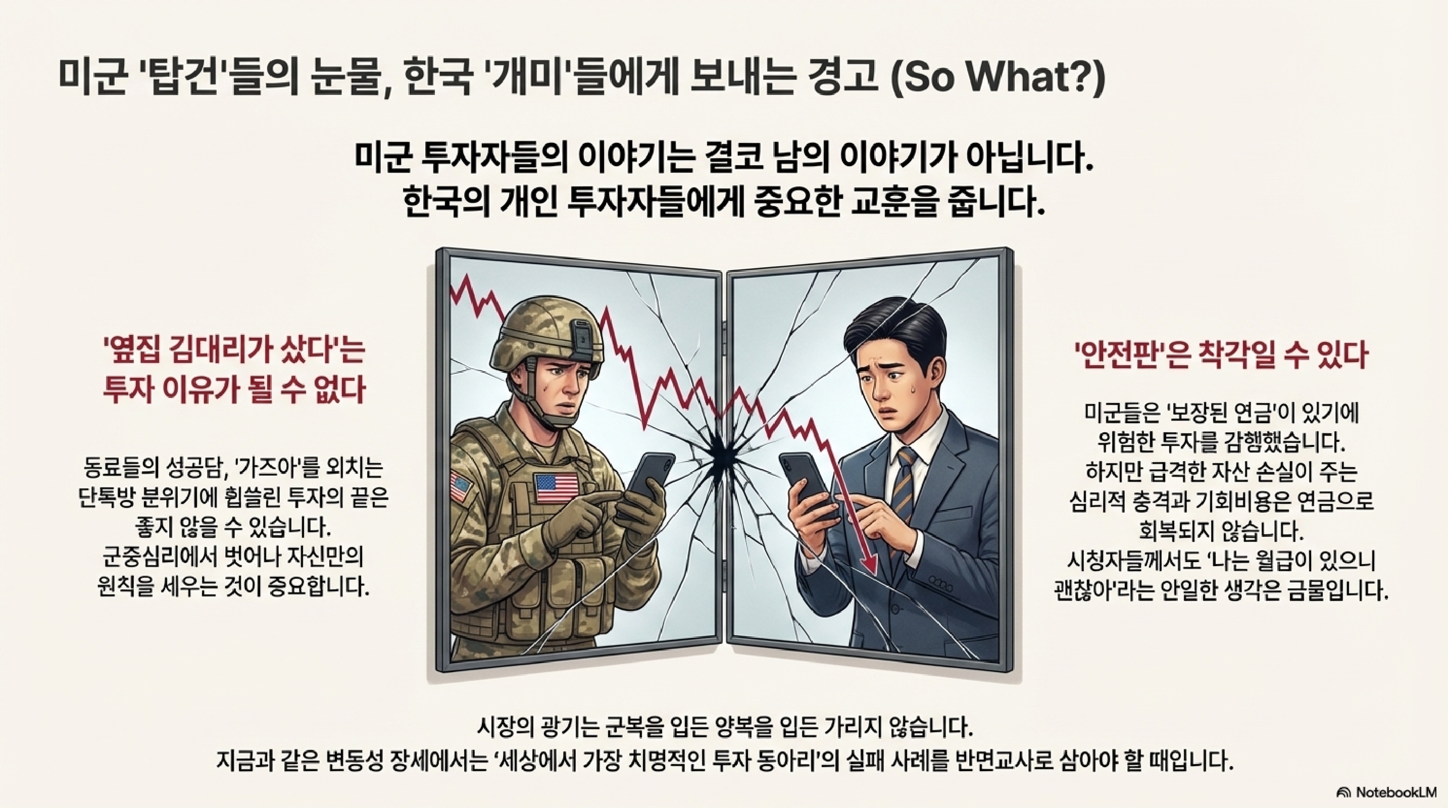 물론 군인들은 "우리는 20년만 복무하면 연금이 나오고 직업 안정성도 높으니, 더 큰 위험을 감수할 수 있다"고 항변할지도 모릅니다. 하지만 과연 그것이 거대한 시장의 변동성 앞에서 현명한 판단일까요? 이 질문에 대한 답은 그리 오래 걸리지 않아 나타나기 시작했습니다.