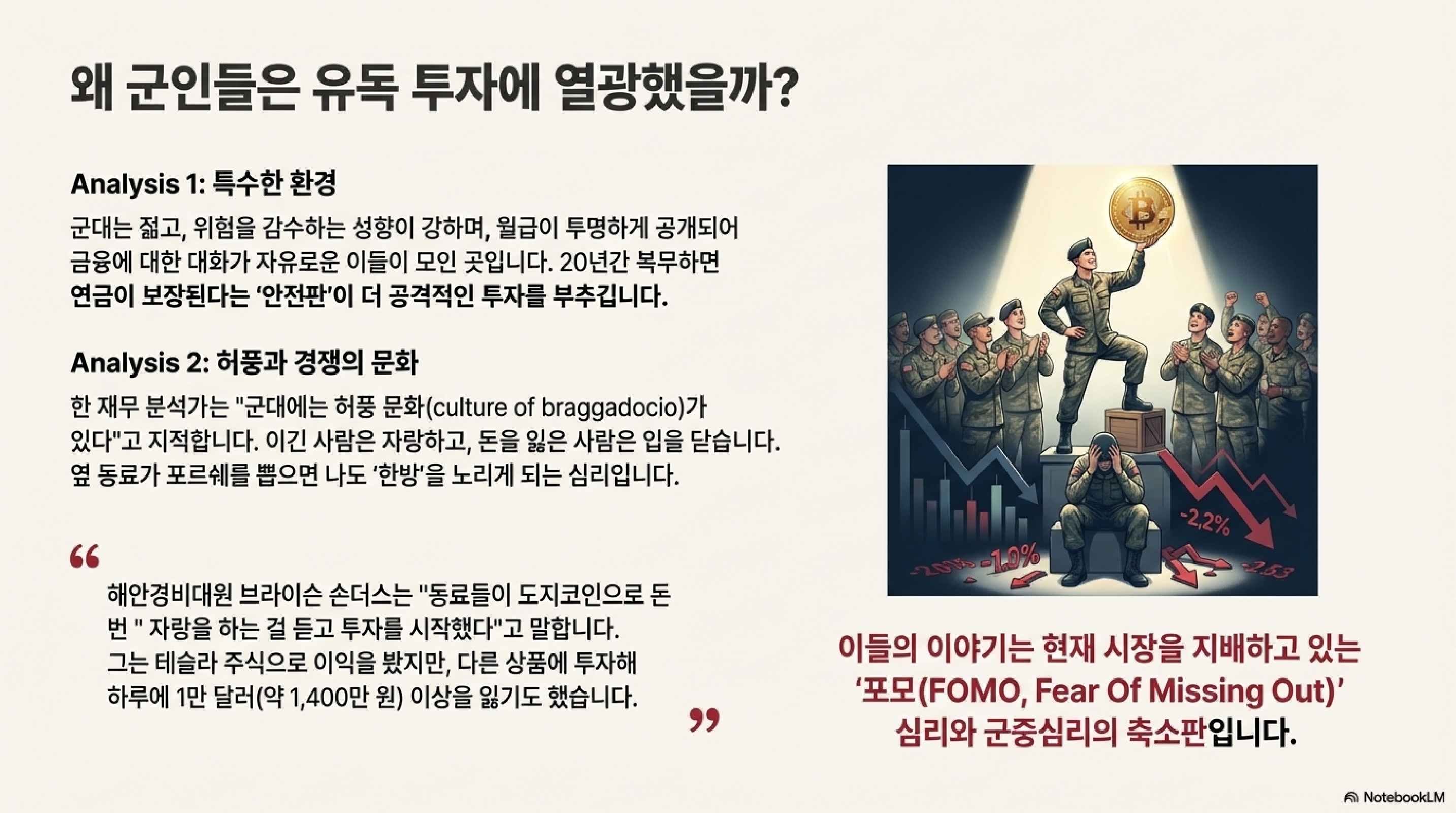 이러한 투자 열풍의 이면에는 분명한 위험이 도사리고 있습니다. 공군 베테랑 출신 재무 자문가 브라이언 오닐은 "큰 조정장이 오면 그들은 큰 고통을 겪을 것"이라고 경고합니다. 특히 군대 내에 팽배한 **"자랑하려는 문화(culture of braggadocio)"**가 위험한 투자를 부추기고 있다고 지적합니다. 이건 마치 포커판에서 돈 잃은 사람은 조용히 사라지고, 판돈 딴 사람만 목소리를 높이는 것과 같습니다. 막사 전체가 승자들로만 가득 찬 것처럼 보이는 착시효과죠.