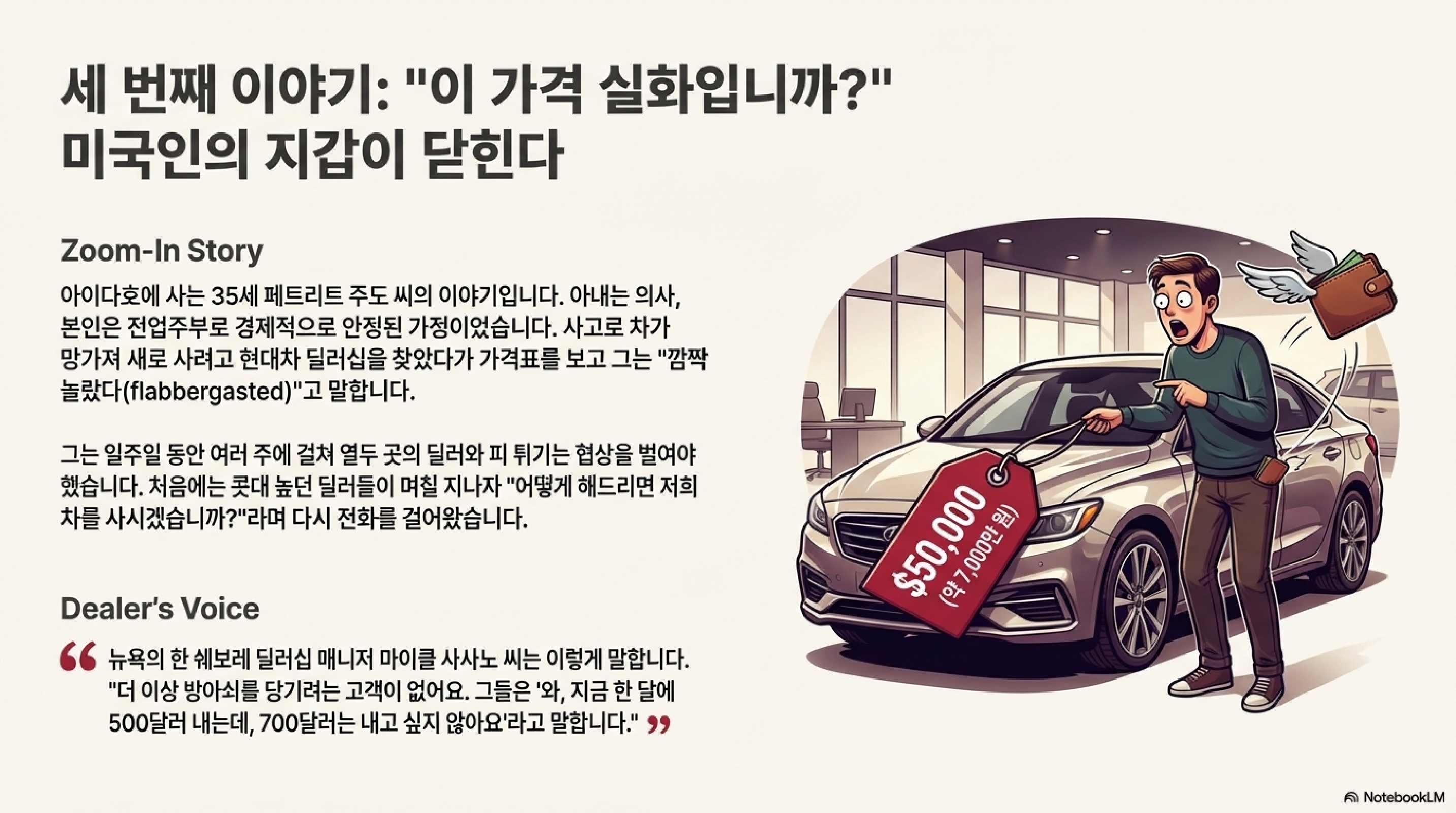 그는 최근 사고로 차를 폐차하고 새 차를 알아보고 있었습니다. 처음 현대차 매장에 들렀을 때, 그는 가격표를 보고 "깜짝 놀랐다(flabbergasted)"고 합니다. '현대차도 이렇게 비싸졌나' 싶었던 거죠.