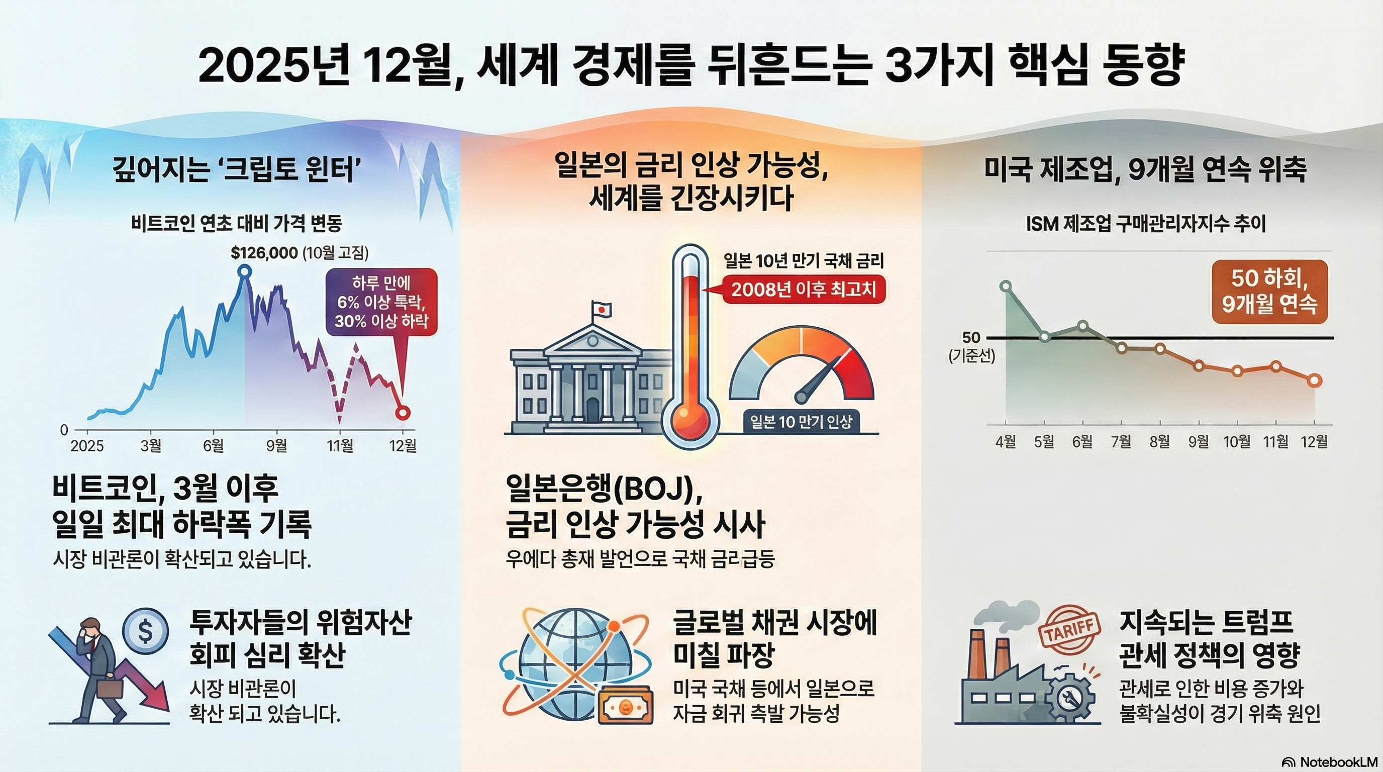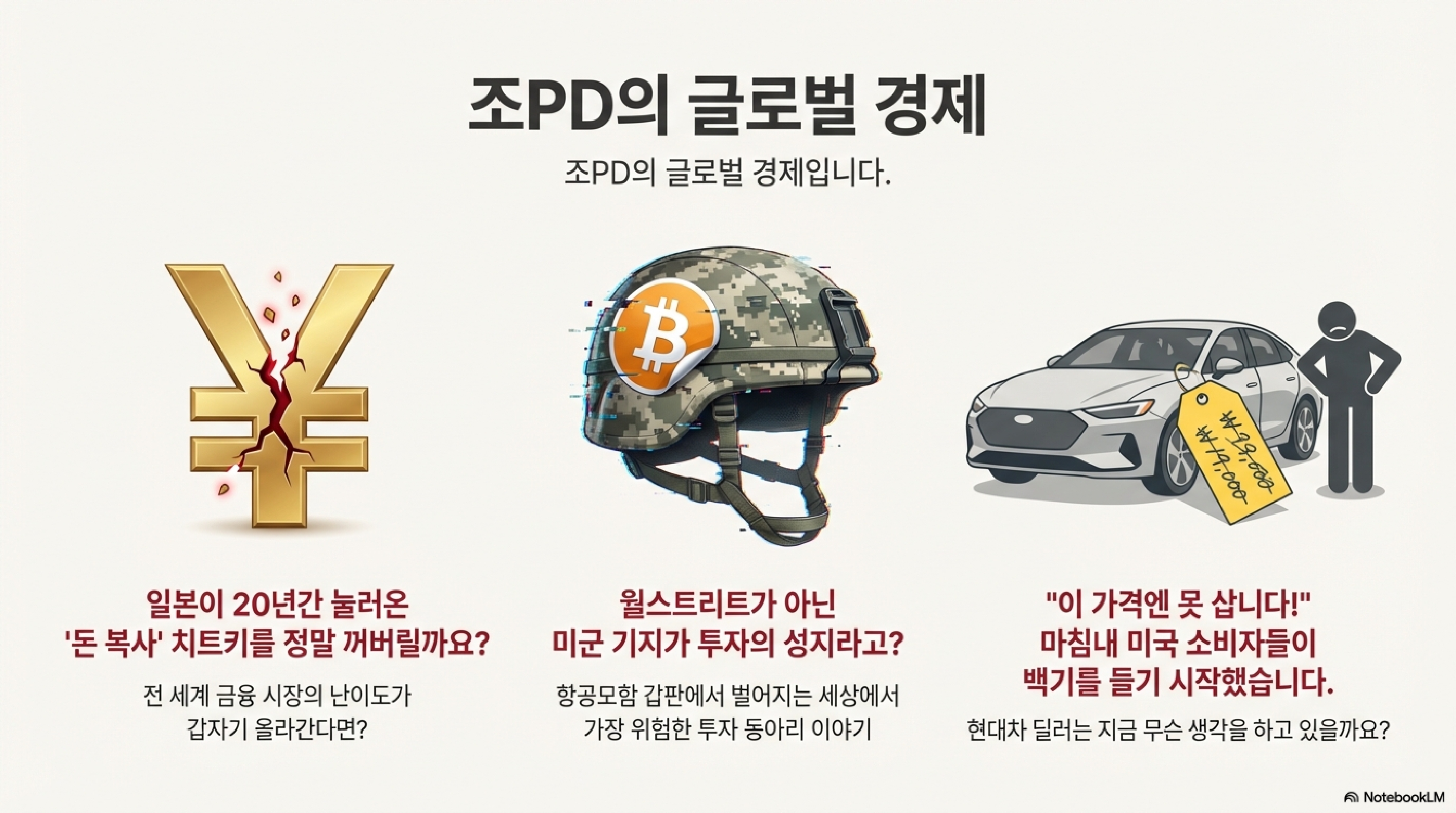 오늘도 숨 가쁘게 달려왔습니다. 월급만으로는 부족해 위험한 투자에 뛰어든 미군들의 모습에서 개인의 욕망과 불안을, 비트코인의 폭락과 얼어붙은 자동차 시장에서 시장의 공포와 위축된 소비 심리를, 그리고 마침내 움직이기 시작한 일본은행을 통해 국가 단위의 거대한 정책 전환 가능성을 엿보았습니다.