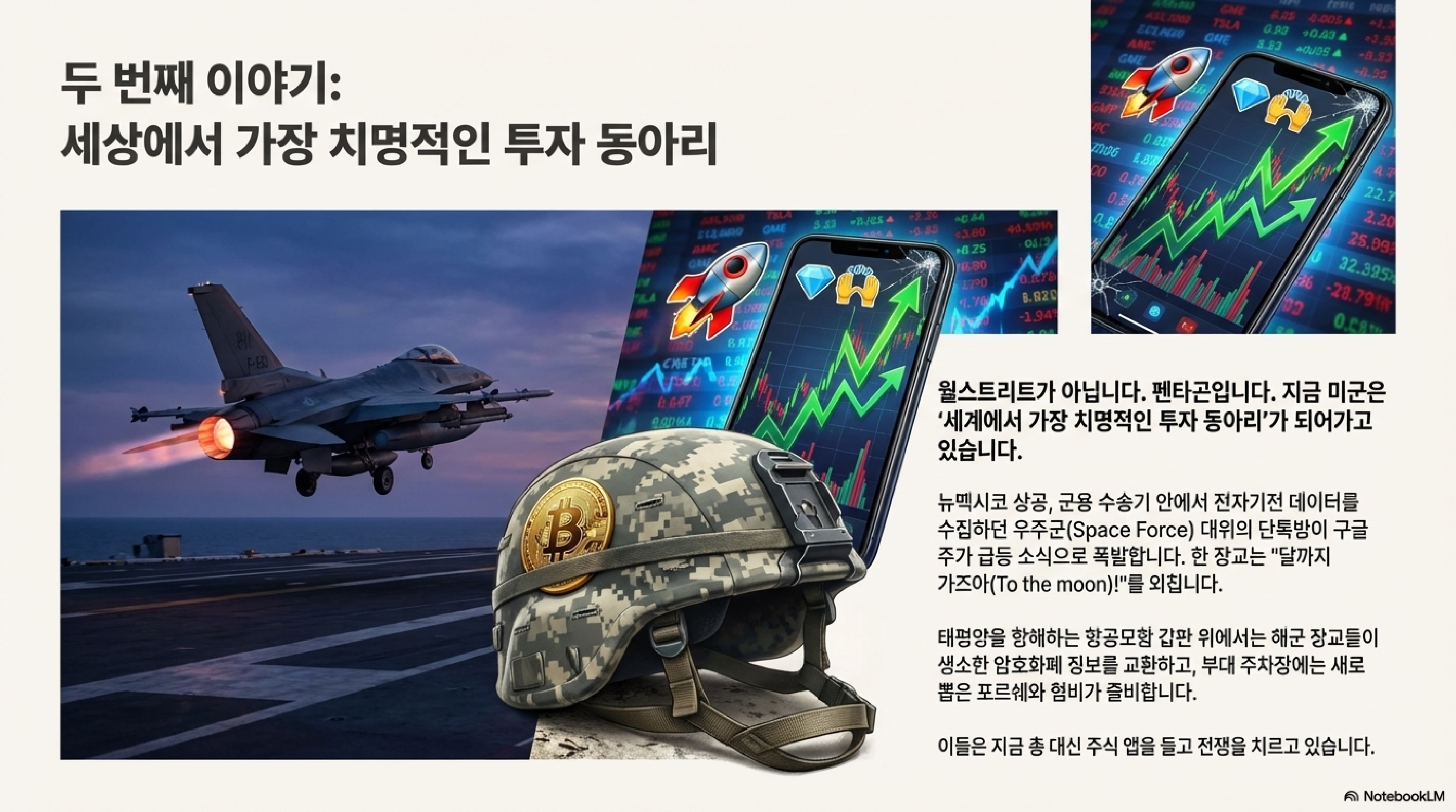 우리가 '군인'하면 떠오르는 이미지가 있죠. 절도 있는 모습, 강인한 체력, 그리고 국가에 대한 헌신. 그런데 여기에 '코인 트레이더', '주식 고수'라는 이미지를 덧붙여야 할지도 모르겠습니다. 오늘 첫 이야기는 세계 최강 미군이라는 특수한 집단 내부에서 불고 있는 주식과 암호화폐 투자 광풍에 대한 것입니다.