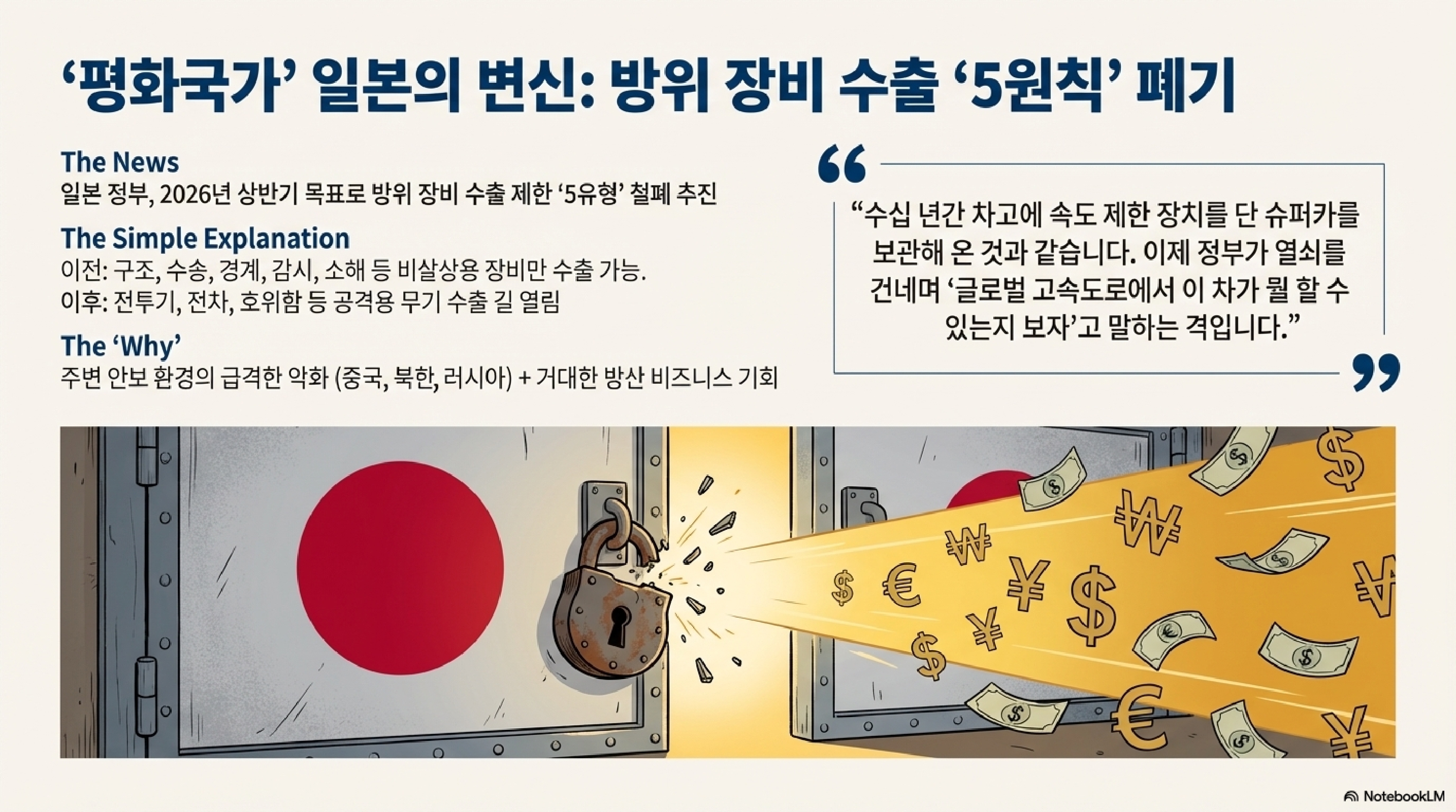 자, 시청자 여러분. 이건 정말 역사적인 사건입니다. 전후 수십 년간 일본은 '무기는 만들지만 팔지는 않는다'는 원칙을 고수해왔습니다. 평화헌법의 정신에 따라 살상 무기 수출을 극도로 제한해 온 거죠. 그런데, 이 봉인이 드디어 풀립니다.