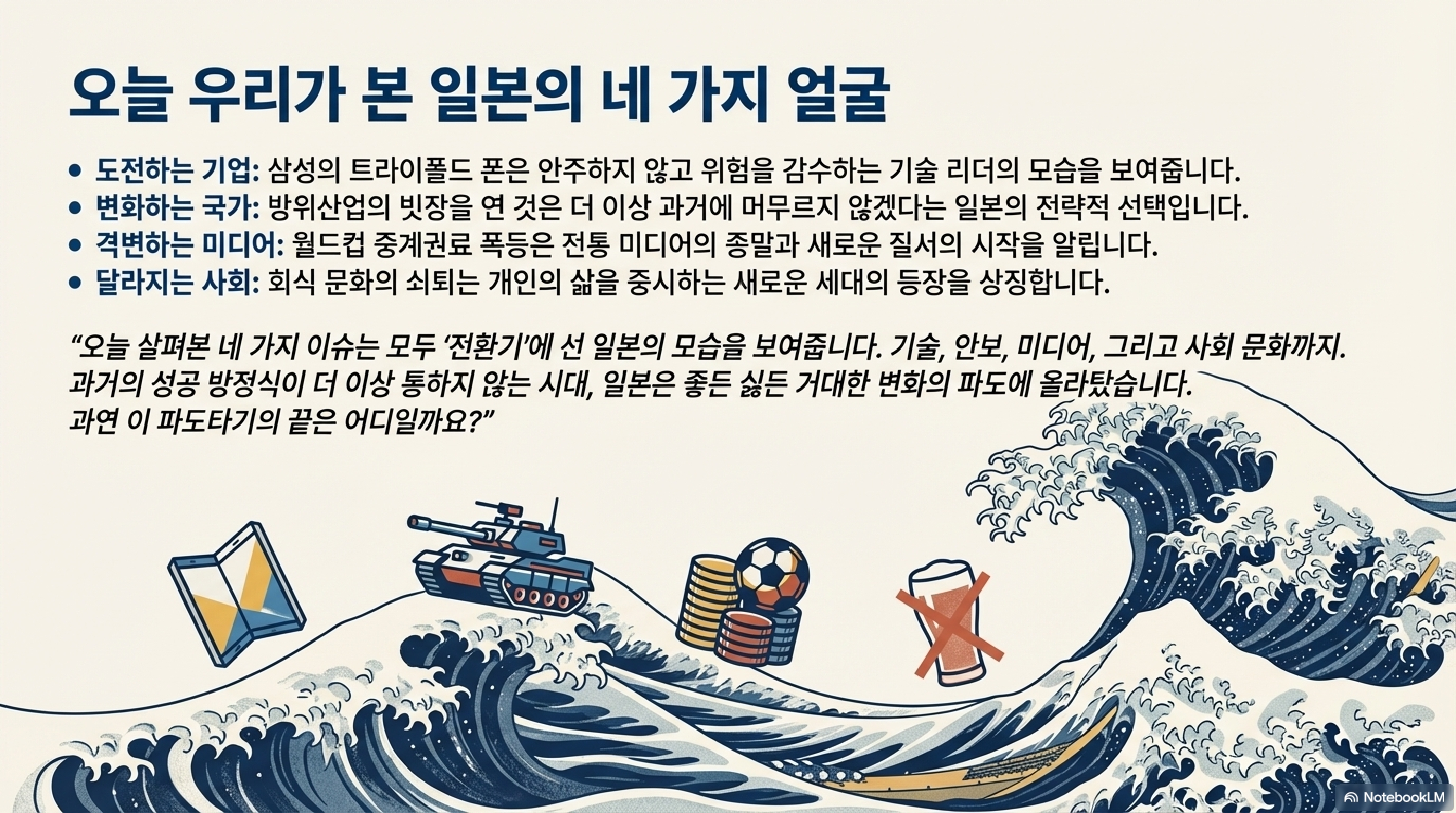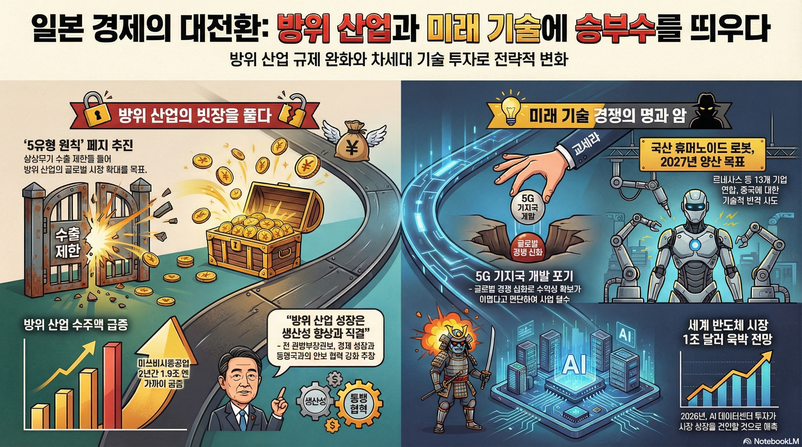 일본 기업 내부에서 시작된 이 혁신의 바람이, 이제는 일본의 국가 정체성과도 같았던 '평화주의'의 빗장마저 열어젖히고 있습니다. 마지막 주제가 가장 충격적일 수 있습니다.
