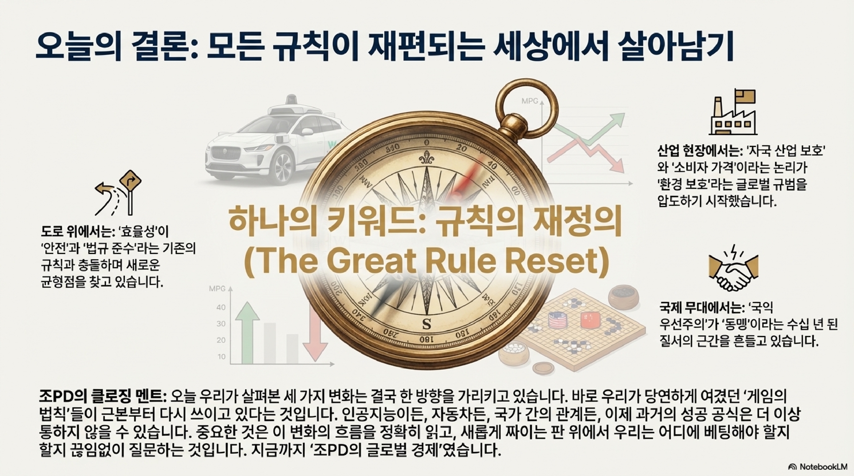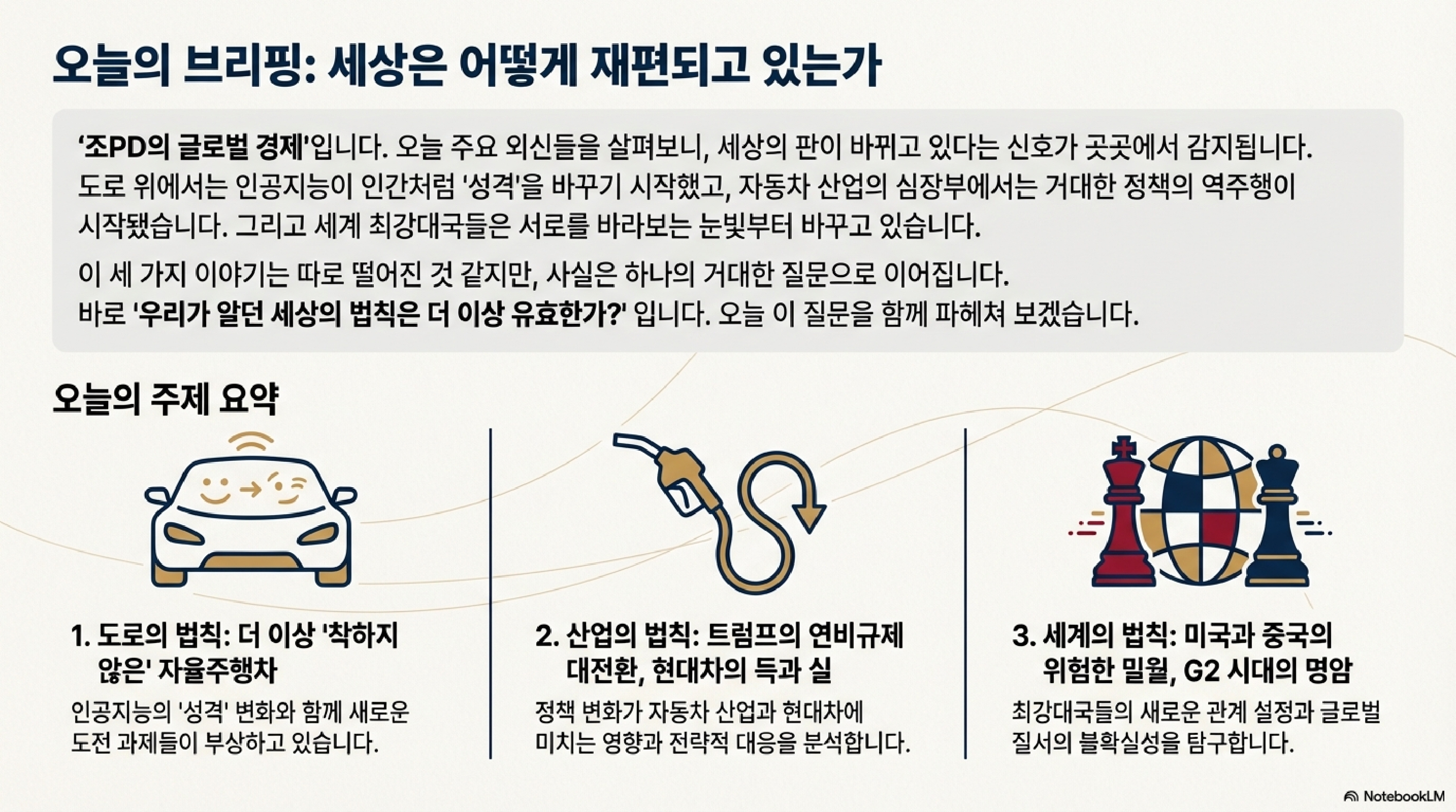 오늘 우리는 세 가지 이야기를 통해 세상의 복잡한 단면들을 들여다봤습니다. 인간을 닮아가면서 규칙을 어기기 시작한 AI의 이야기, 자동차 산업의 미래를 걸고 벌어지는 치열한 정책 싸움, 그리고 국가 경제가 붕괴된 땅에서 펼쳐지는 기이한 일상까지.