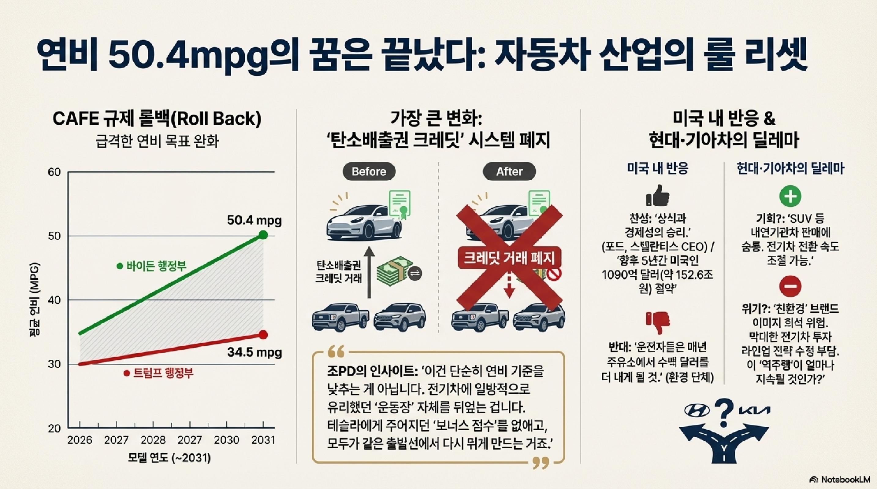 그럼 이게 현대차나 기아에게는 어떤 영향을 미칠까요? 굉장히 복합적입니다. 단기적으로는 연비 기준이 널널해졌으니, 미국 시장에서 잘 팔리는 내연기관 SUV 같은 차들을 파는 데 부담이 줄어들 겁니다. 하지만 장기적으로는 미국 시장 전체의 전기차 전환 속도를 늦출 수 있습니다. 이는 전기차 시장에서 승부를 보려는 우리 기업들의 장기 전략에 차질을 줄 수도 있는 부분이죠.