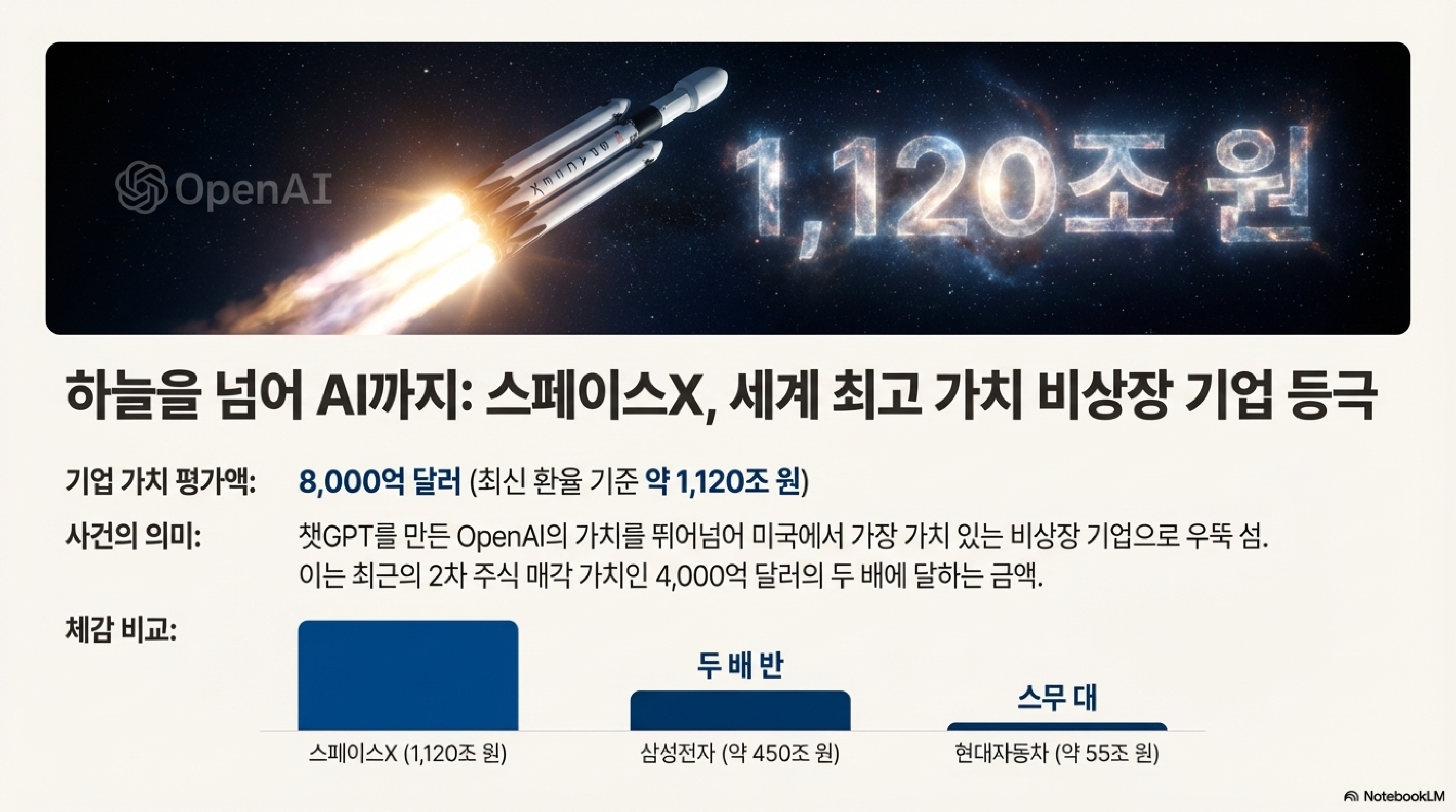 스페이스X가 2차 주식 매각을 통해 무려 8000억 달러, 우리 돈 약 1,120조 원의 기업가치를 인정받았습니다. 이게 얼마나 엄청난 돈이냐면요, 우리나라 1년 예산의 거의 두 배에 달하는 돈이고요, 삼성전자 시가총액의 두 배가 넘는 가치입니다. 비상장 기업 하나가 말이죠.