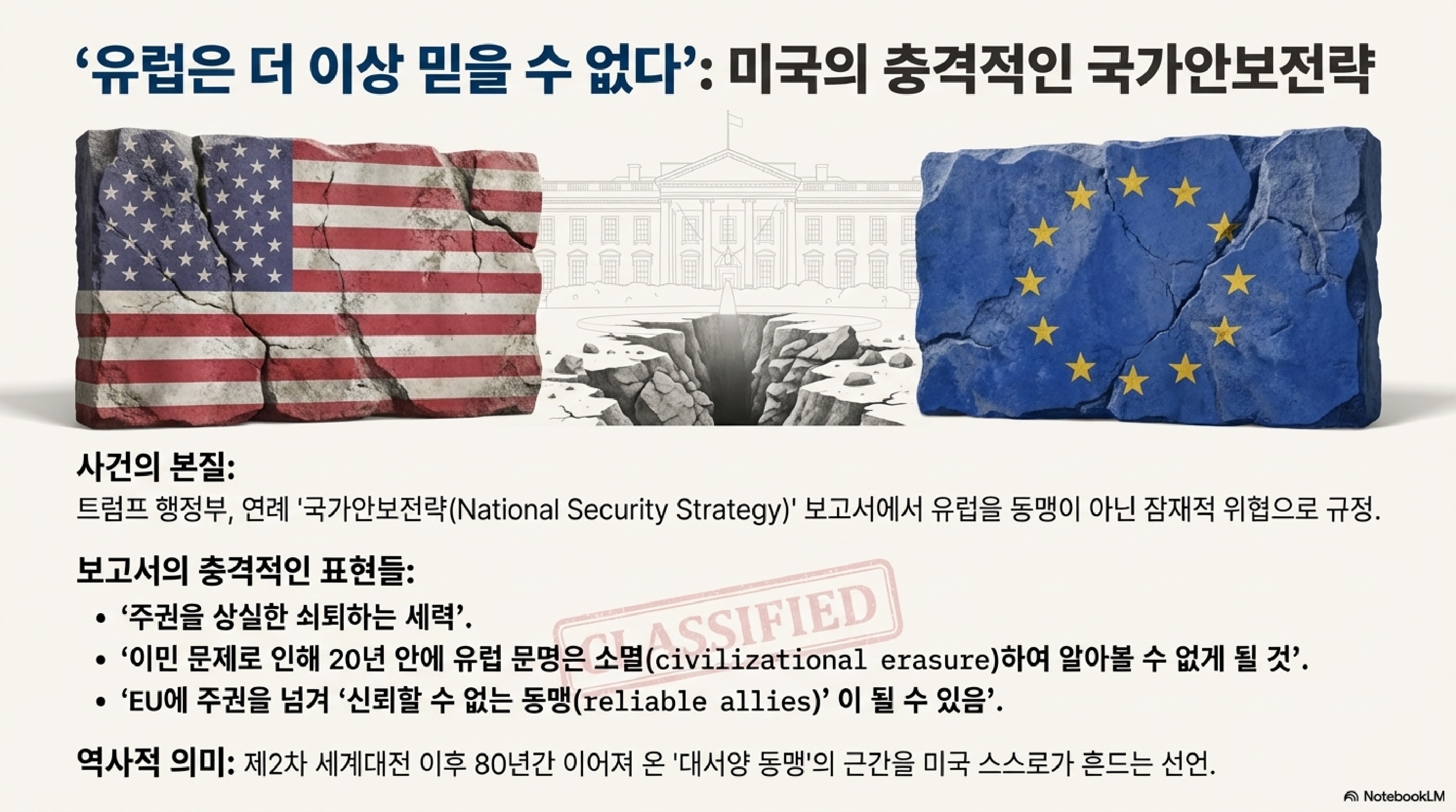 그런데 이번에 나온 트럼프 행정부의 보고서는요, 그 타겟이 완전히 다릅니다. 중국? 러시아? 아니요. 가장 신랄하고 가혹한 비판의 화살이 향한 곳은 바로 미국의 가장 오랜 동맹, 유럽이었습니다. 이건 단순한 외교적 마찰이 아닙니다. 2차 세계대전 이후 80년간 세계 질서를 지탱해 온 '대서양 동맹'이라는 기둥뿌리가 통째로 흔들리는, 그야말로 충격적인 사건입니다.