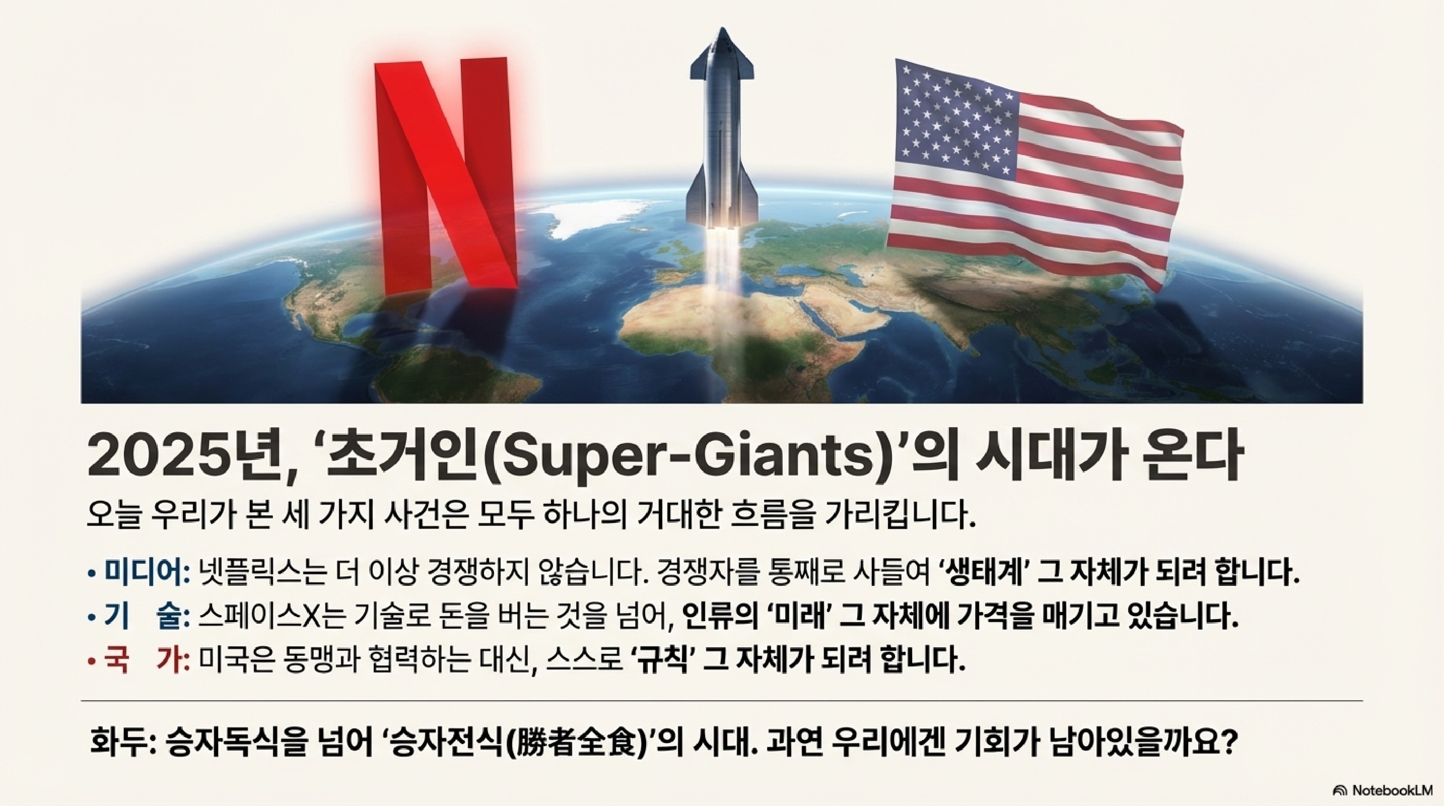 콘텐츠 시장은 넷플릭스라는 공룡이 모든 것을 집어삼키고 있고, 우주 기술은 스페이스X라는 괴물이 독주하고 있으며, 국제 질서는 미국이라는 초강대국이 동맹이라는 낡은 규칙마저 부수고 있습니다.