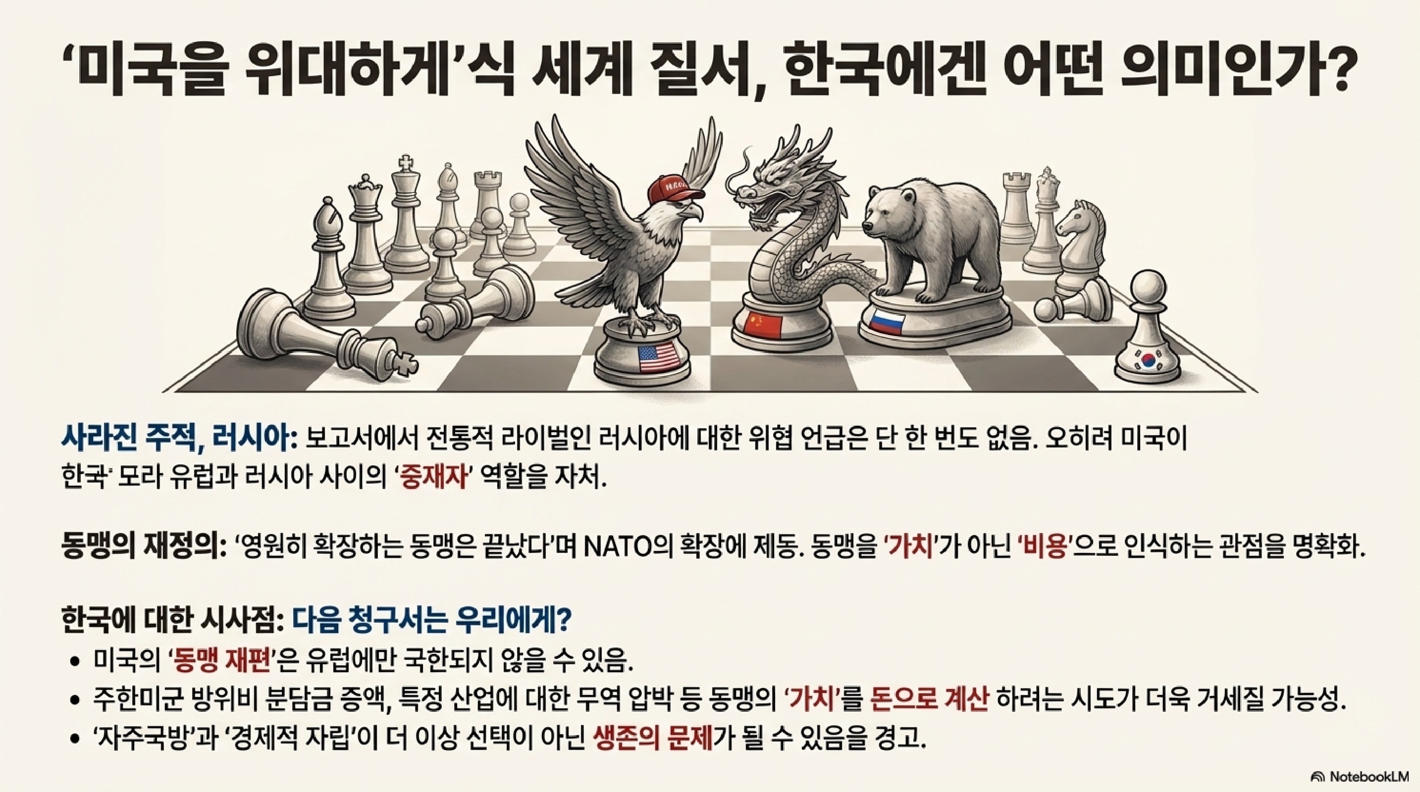 미국이 유럽 동맹을 대하는 방식은, 앞으로 한미 동맹이 어떻게 변할 수 있는지를 보여주는 '미리 보기'와 같습니다. 이번 미국의 국가안보전략 보고서는 유럽뿐만 아니라, 우리에게도 엄청난 '기상나팔'이 될 수 있습니다. 정신 똑바로 차리고 우리가 어떤 준비를 해야 할지 심각하게 고민해야 할 때입니다.