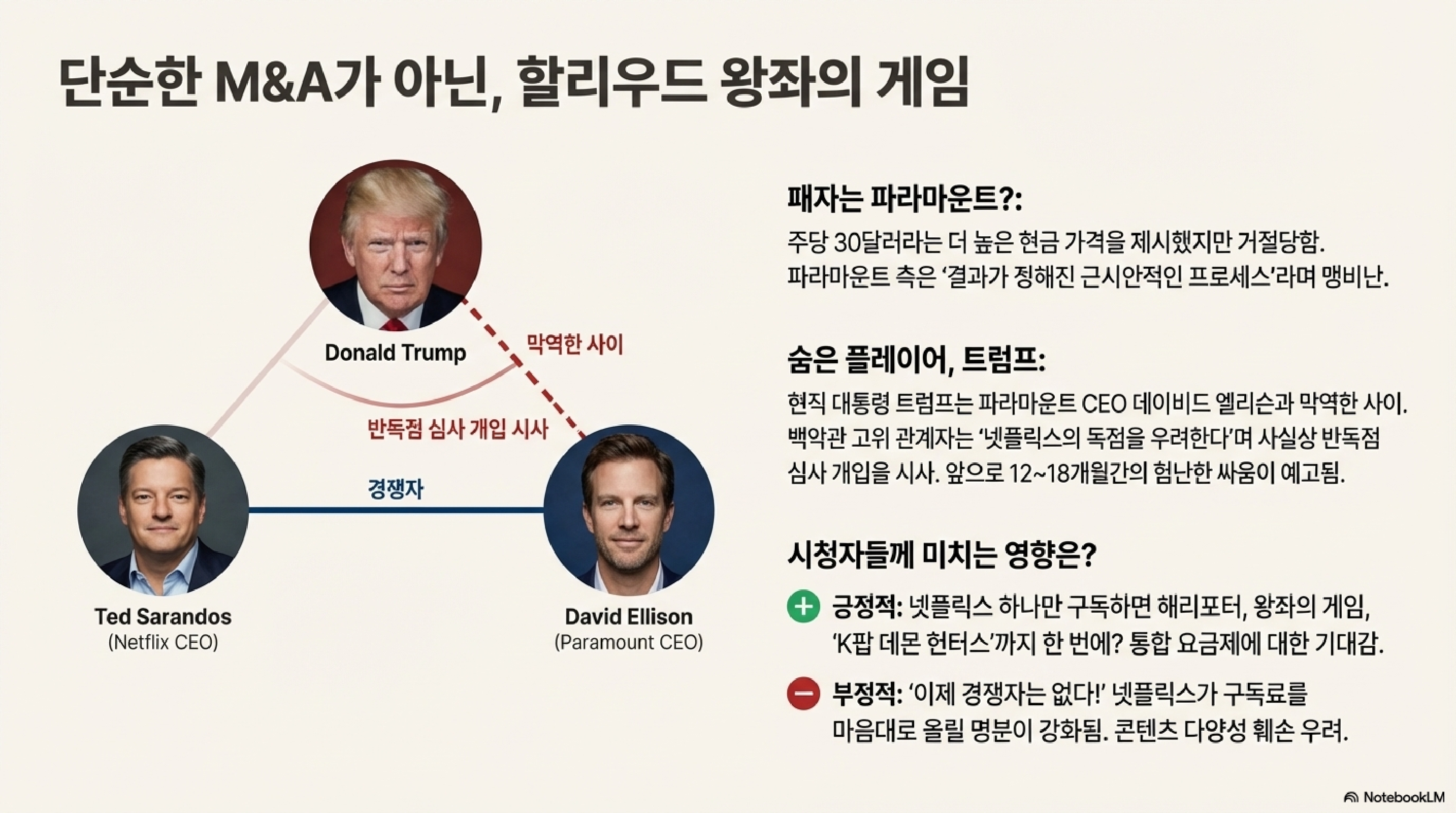 그런데 이 딜이 그냥 돈 놓고 돈 먹기가 아닌 게, 여기에 현직 대통령, 바로 트럼프가 껴있습니다. 이 M&A는 단순한 경제 뉴스를 넘어 한 편의 정치 스릴러가 되고 있습니다.