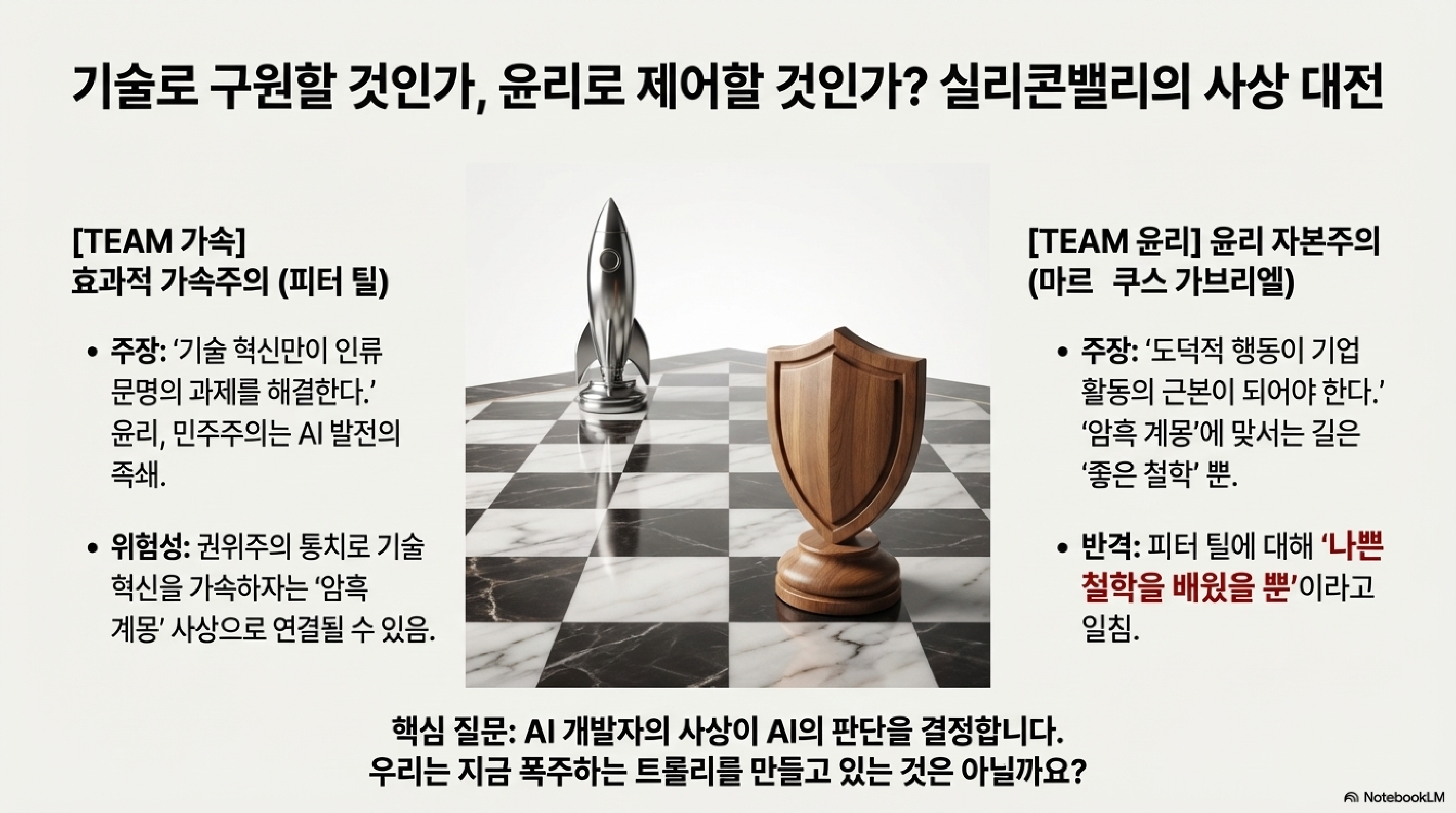 그런데 이 철학자들도 한목소리를 내는 건 아닙니다. 지금 실리콘밸리에서는 AI의 미래를 놓고 두 거대한 사상이 정면충돌하고 있습니다.