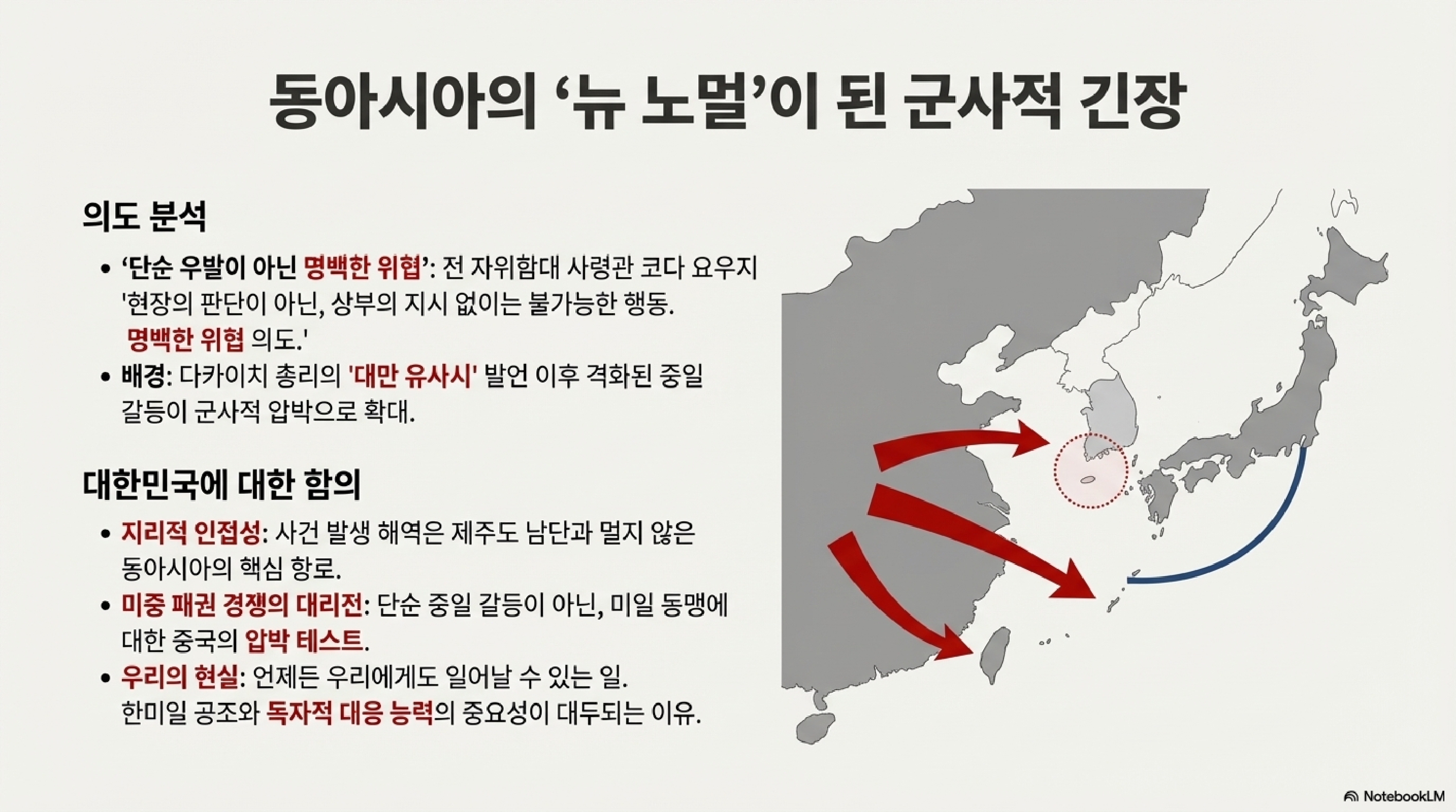 자, 분위기를 바꿔보겠습니다. 이번에는 동중국해 상공에서 벌어진 일촉즉발의 군사적 대치 상황입니다. 이 사건은 단순한 해프닝이 아니라, 미중 갈등이라는 거대한 파도 속에서 동북아의 지정학적 긴장이 얼마나 높아지고 있는지를 보여주는 중요한 바로미터입니다.
