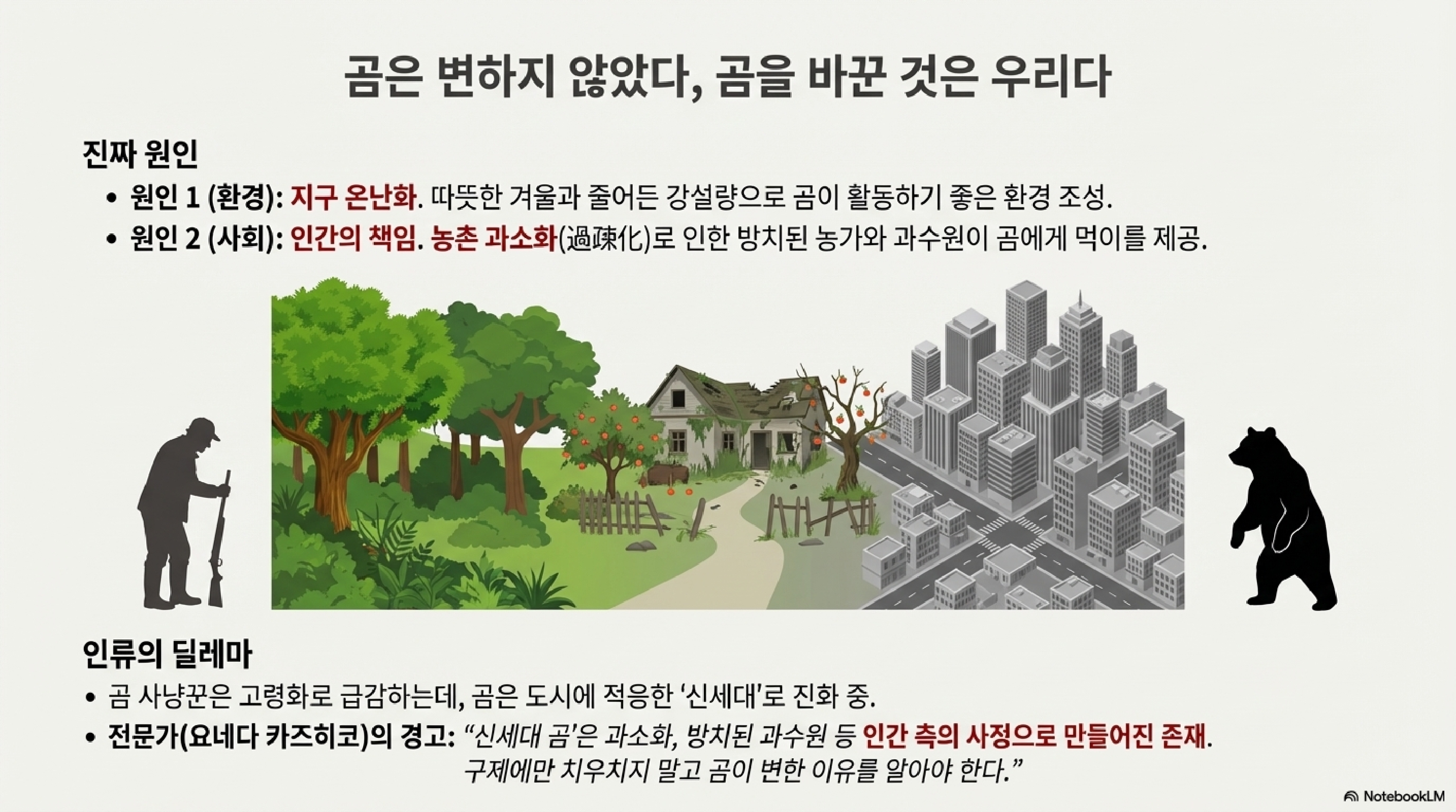 우리는 곰을 그저 '문제'로만 치부하기 쉽습니다. 하지만 전문가들은 다른 시각을 제시합니다. NPO 법인 '일본 츠키노와구마 연구소'의 요네다 가즈히코(米田一彦) 이사장은 "인간이 방치한 과수원이나 쇠퇴한 마을 등 인간 측의 사정이 곰을 도시로 불러들인 것"이라고 지적합니다. 결국 곰들의 변화는 자연이 우리 인간 사회에 던지는 근본적인 질문일지도 모릅니다. "당신들은 자연과 어떻게 함께 살아갈 것인가?"