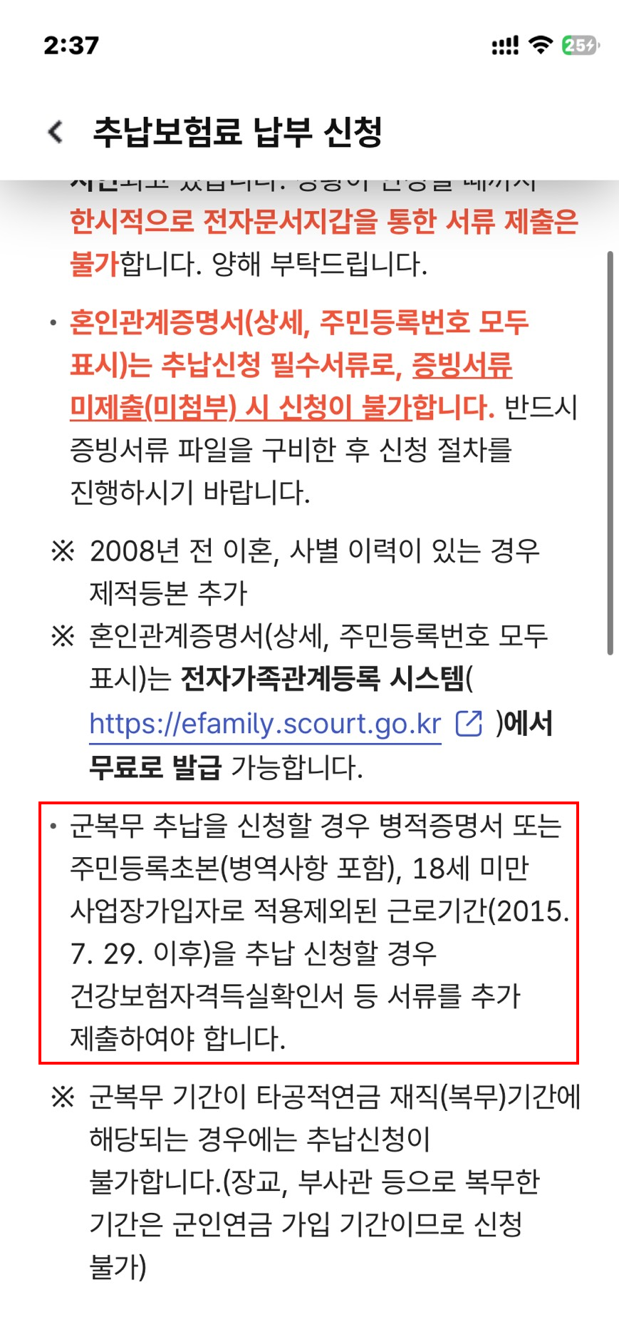 군 복무 기간(약 2년)은 추납 시 가입 기간을 획기적으로 늘려주는 '치트키'입니다.