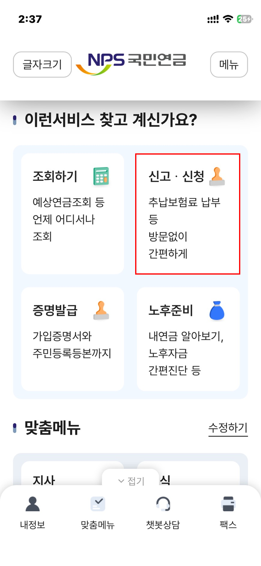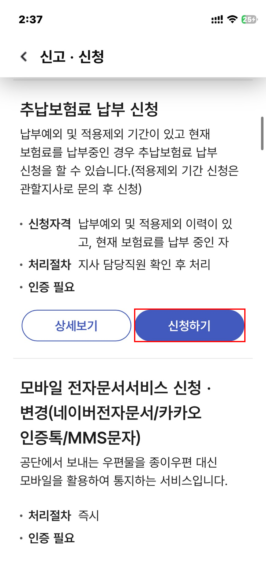 [추납보험료 납부 신청]에서 [신청하기]를 클릭한다.
