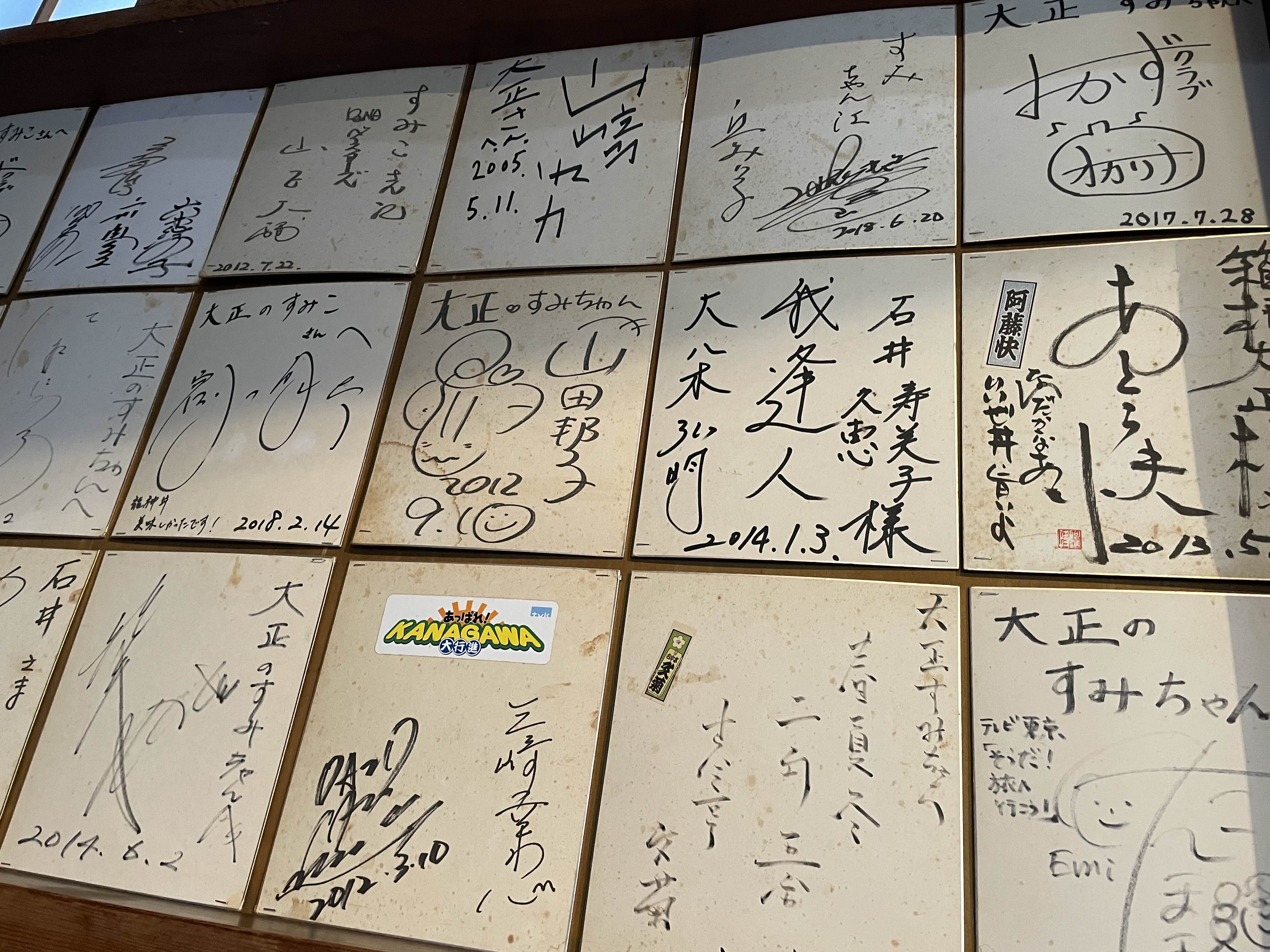 TV 프로그램 '앗파레! 카나가와 대행진' (좌측 하단 스티커): 가나가와현의 유명한 지역 정보 프로그램으로, 데빗 이토(デビット伊東) 등 출연진이 다녀간 흔적입니다.