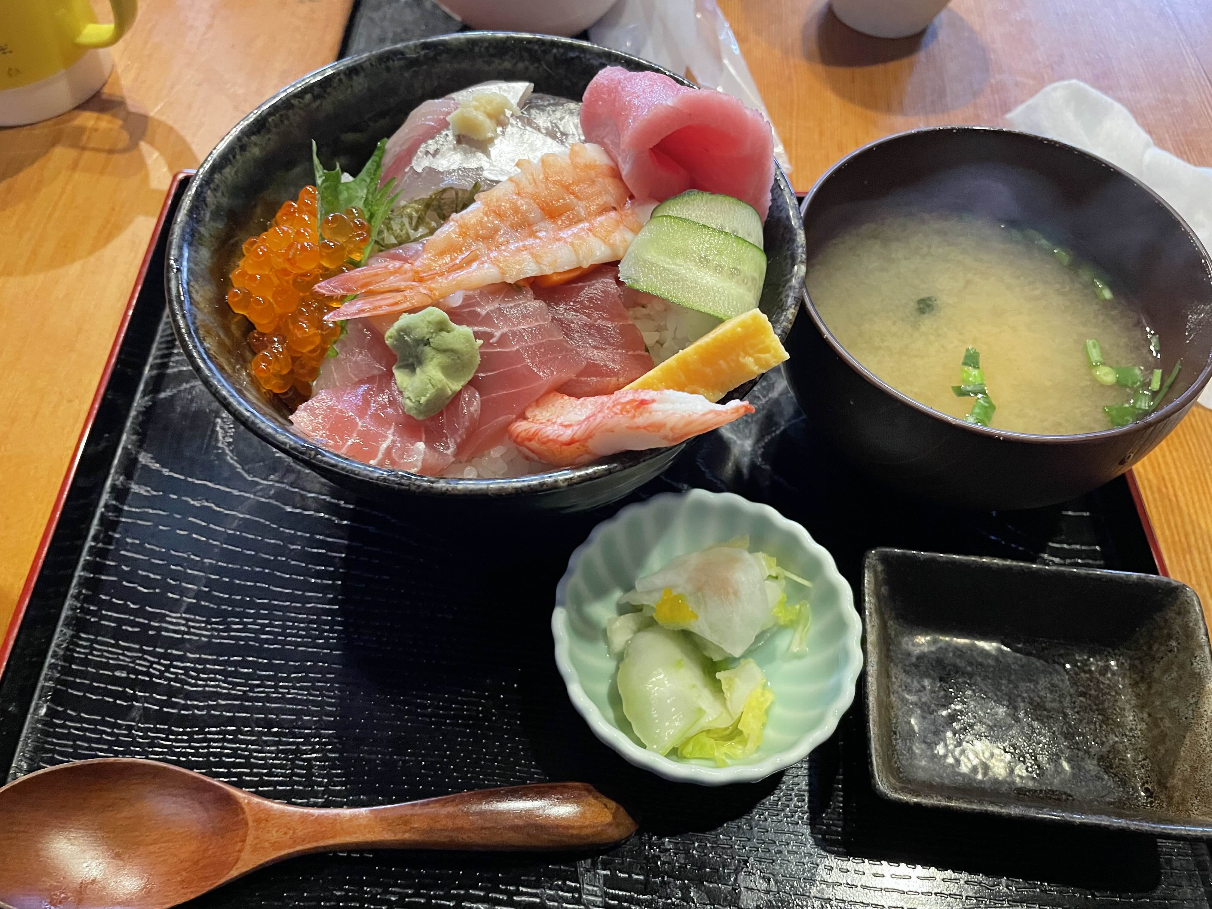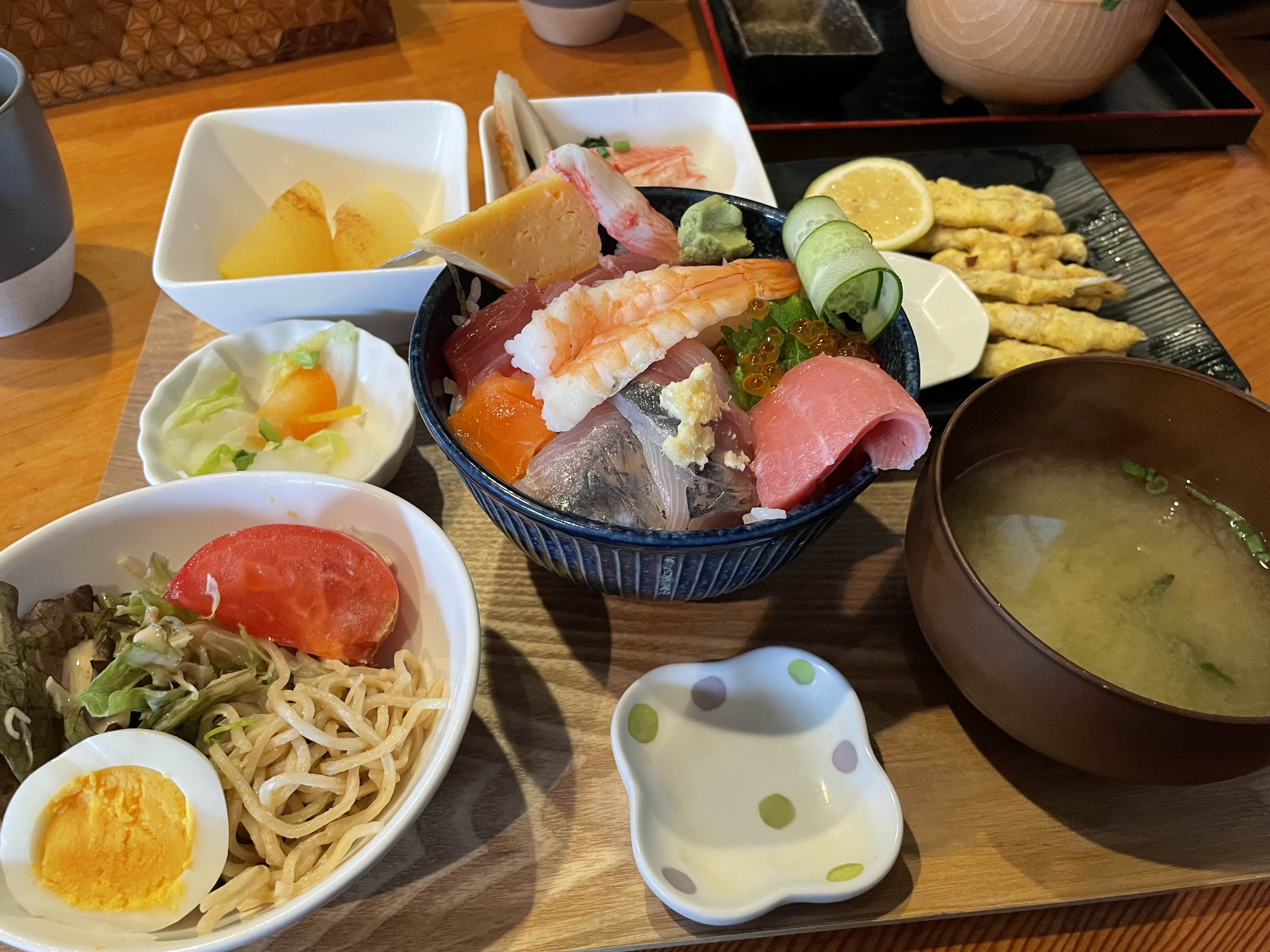 아래는 정식인데 카이센동은 좀 작은 사이즈이지만 주전부리로 나오는 사이드가 풍성한 느낌이다