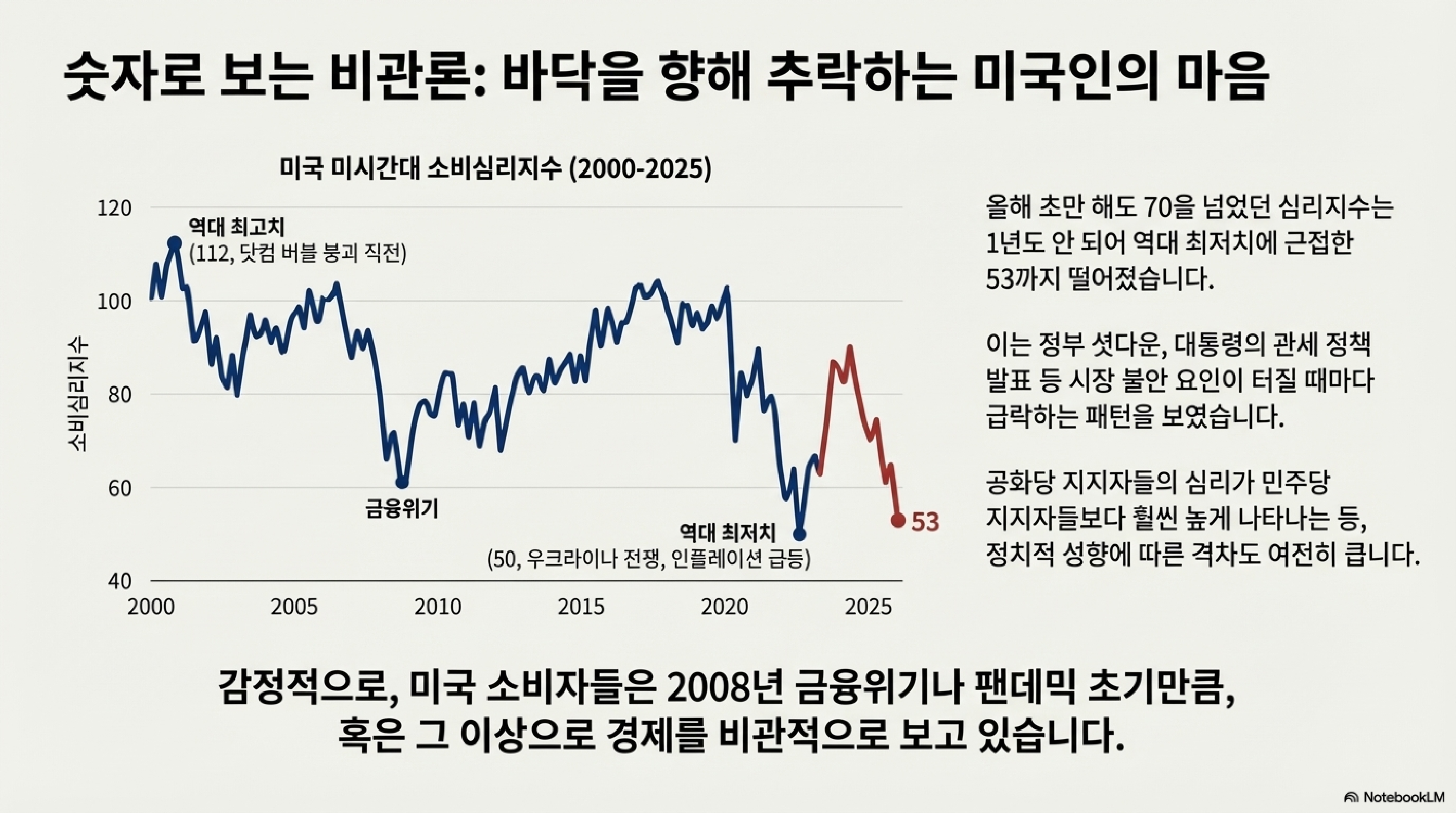 글로벌 경제에서 '소비자 심리'는 단순한 설문조사 수치가 아닙니다. 종종 경기 침체의 도래를 알리는 가장 민감한 경고등, 핵심 바로미터 역할을 하죠. 그런데 지금 미국 소비자들이 보여주는 행태는 경제 전문가들을 단체로 '멘붕'에 빠뜨리고 있습니다. 심리는 최악인데 소비는 계속되는 이 기이한 모순, 대체 무슨 일이 벌어지고 있는 걸까요?