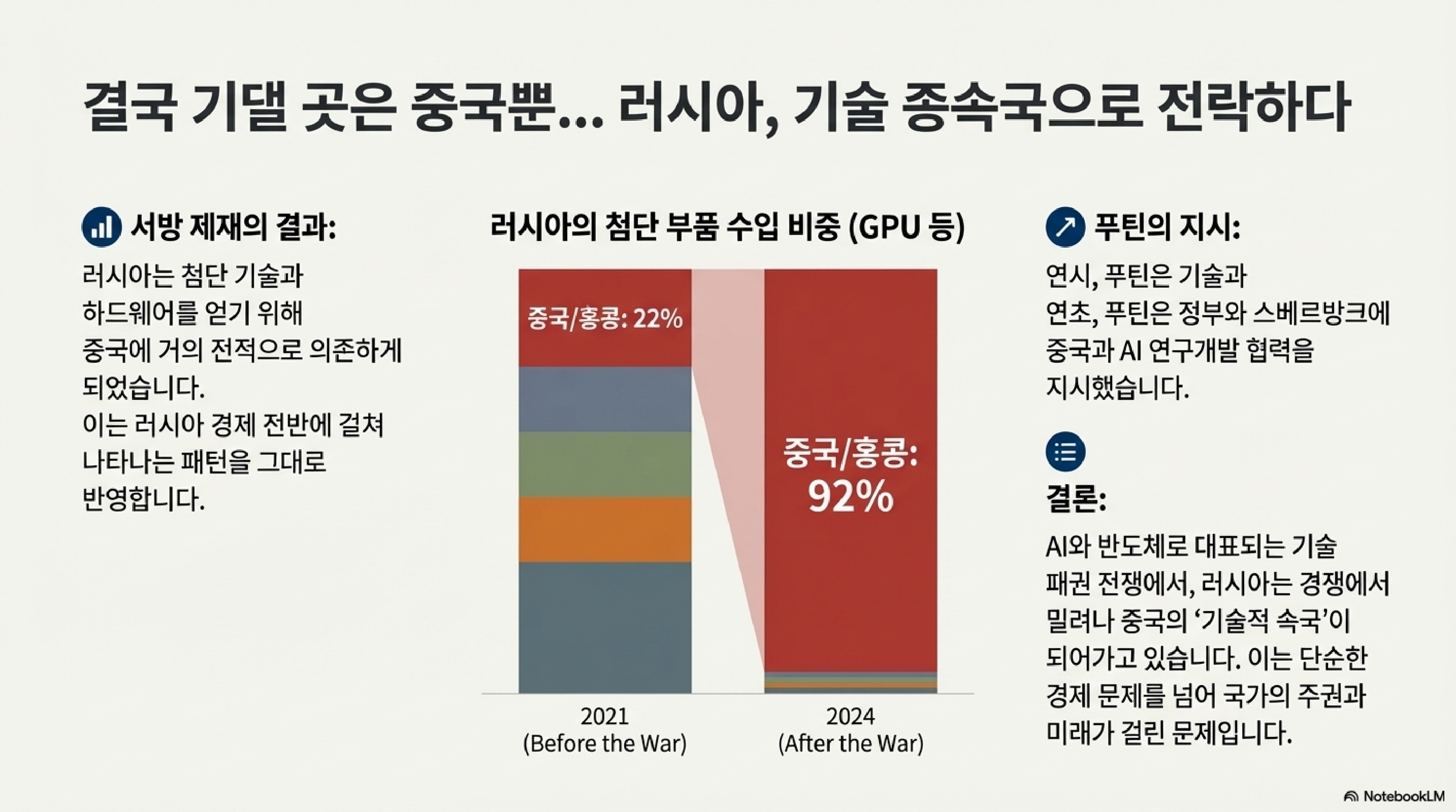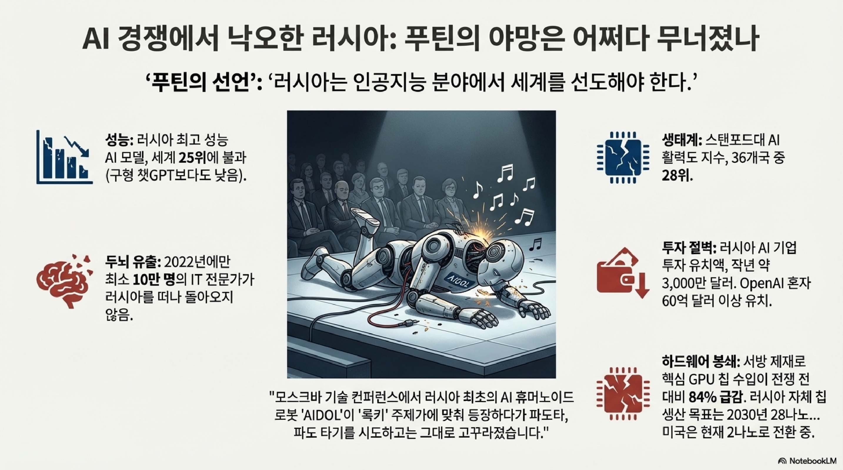이 AI 전쟁은 실리콘밸리에서만 벌어지는 게 아닙니다. 이미 국가의 명운을 건 총성 없는 전쟁터가 되었고, 여기서 러시아는 처참하게 뒤처지고 있죠. 스탠포드 대학의 AI 활력도 평가에서 러시아는 36개국 중 28위에 그쳤습니다. 러시아 AI 기업들이 유치한 벤처 투자액은 고작 3,000만 달러. 반면 OpenAI는 60억 달러 이상을 끌어모았습니다. 서방의 제재로 첨단 반도체 수입 길이 막히고, 전쟁 이후 핵심 인재들이 대거 해외로 빠져나간 '두뇌 유출'이 겹치면서 푸틴의 'AI 대국' 야망은 좌초 위기에 처했습니다. 결국 러시아는 기술적으로 중국에 기댈 수밖에 없게 되었고, 이는 "이웃 국가에 대한 경제적 종속(economic vassalage to its neighbor)"을 심화시키고 있습니다. 기술 패권이 곧 국가의 미래임을 극명하게 보여주는 사례입니다.