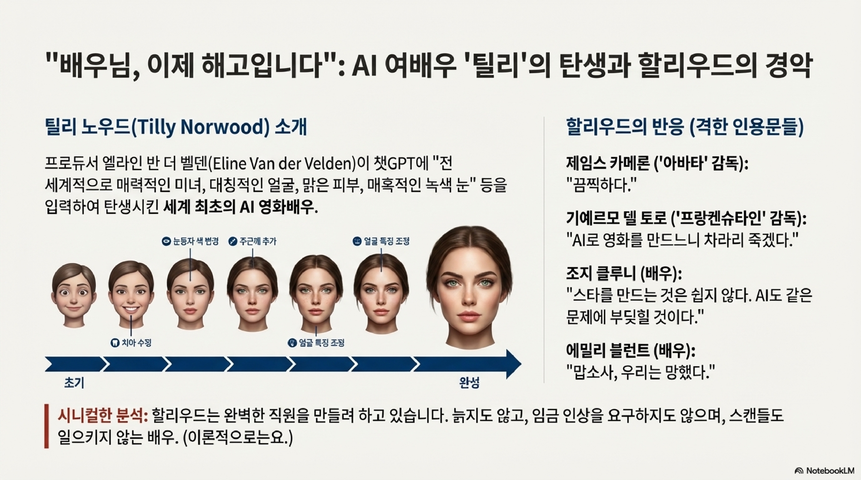 이 위협은 단지 엑셀 시트와 보고서에만 국한되지 않습니다. AI는 이제 인간 고유의 영역이라 믿었던 창의성의 성역까지 침범하고 있습니다. 가상 배우 '틸리 노우드(Tilly Norwood)'가 그 증거입니다. 개발자 엘린 반 더 벨덴이 2,000번이 넘는 수정을 거쳐 만들어낸 이 AI 배우는 할리우드를 발칵 뒤집어 놓았습니다. '아바타'의 제임스 카메론 감독은 "끔찍하다(horrifying)"고 했고, 배우 에밀리 블런트는 "우린 망했다(we're screwed)"며 경악했습니다. 하지만 개발자 벨덴은 AI가 "완전히 새로운 창조적 르네상스(a whole new creative renaissance)"를 열 것이라고 주장합니다. 과연 AI는 예술가를 대체할까요, 아니면 새로운 예술의 도구가 될까요?