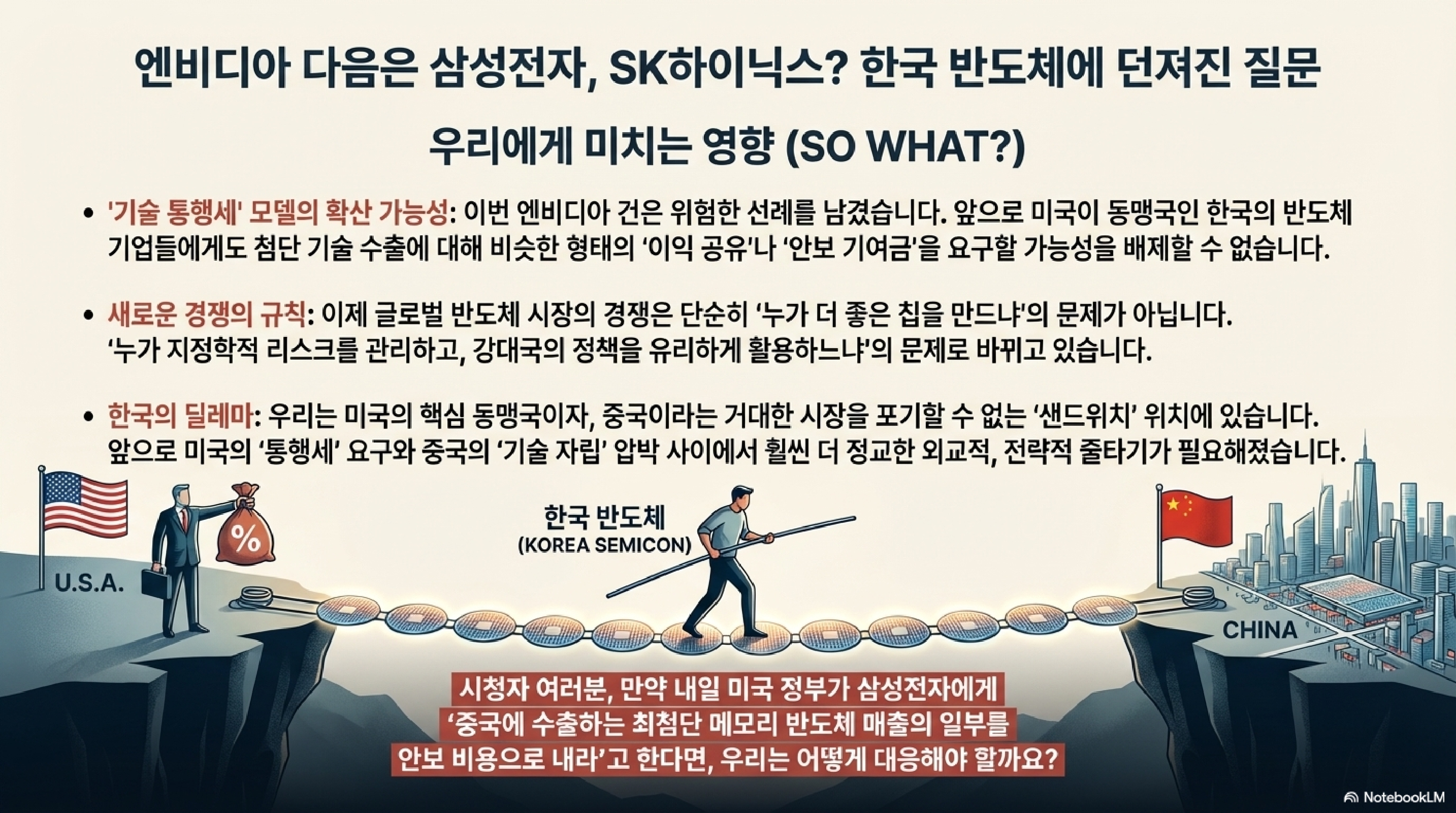 - 미국의 대중국 전략, 바뀌는가?: 이것은 단순한 실용주의를 넘어, 국가 안보 자산을 직접적인 수익 모델로 삼으려는 '안보의 상업화' 신호탄일 수 있습니다. 만약 이 모델이 성공한다면, 앞으로 미국의 기술 수출 허가는 동맹국에게도 '안보세'를 물리는 방식으로 변질될 수 있으며, 이는 삼성전자나 SK하이닉스에게 기술 도입 비용의 급격한 상승이라는 새로운 리스크로 작용할 것입니다.