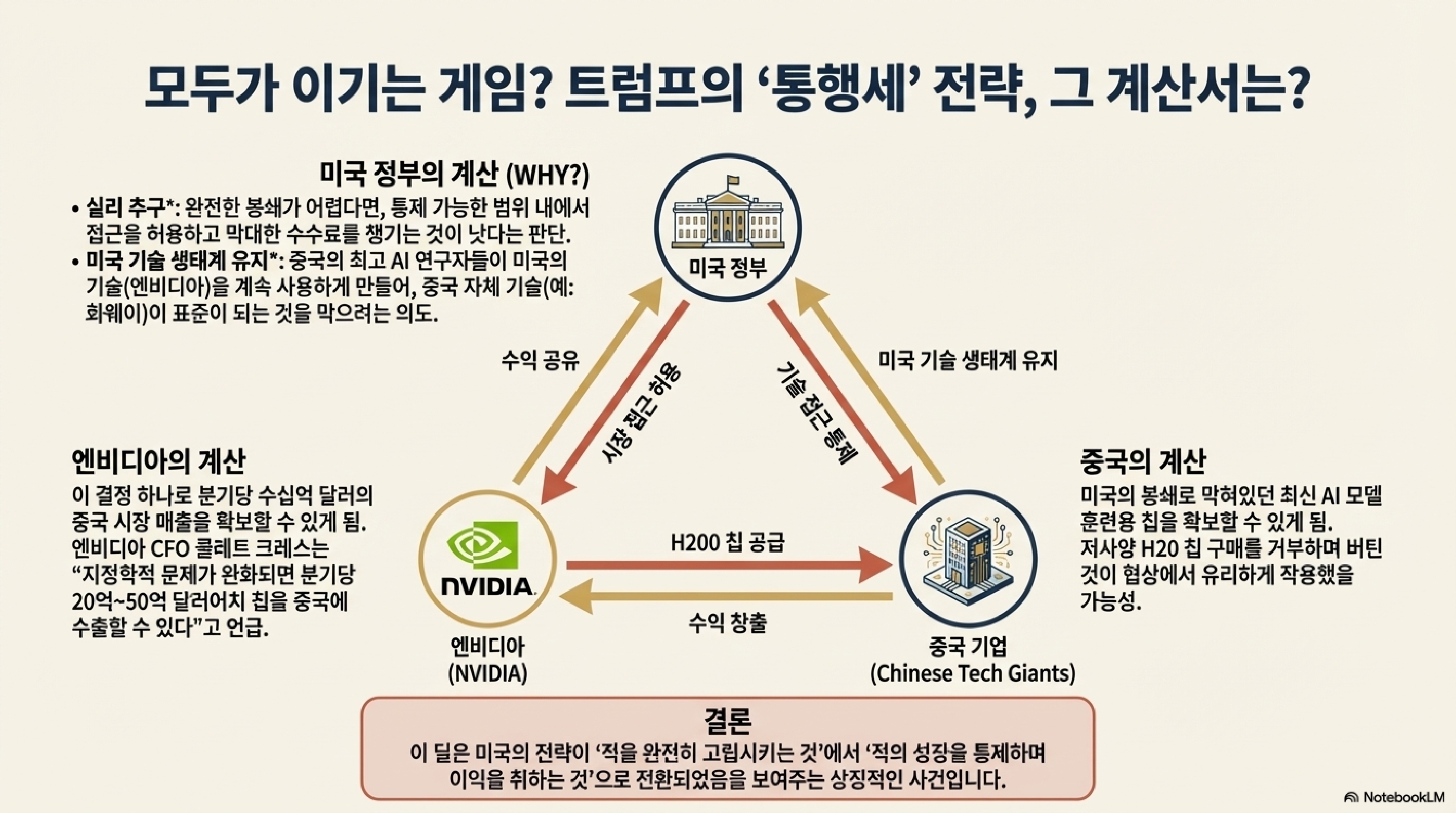 상상해보십시오. 최첨단 기술 제품을 경쟁국에 판매하도록 허용하면서, 그 매출의 일부를 정부가 가져간다는 조건을 내건다면 어떨까요? 공상과학 소설이 아니라 지금 실제로 벌어지고 있는 일입니다. 트럼프 대통령이 엔비디아의 최첨단 AI 칩인 'H200'의 대중국 수출을 허용하되, 매출의 25%를 미국 정부가 '통행세'처럼 가져간다는 전례 없는 딜을 발표했습니다. 이는 국가 안보와 자유 시장 경제 원칙 사이에서 벌어지는 기묘한 줄타기이자, 트럼프 행정부의 예측 불가능한 스타일을 여실히 보여주는 사건입니다.
